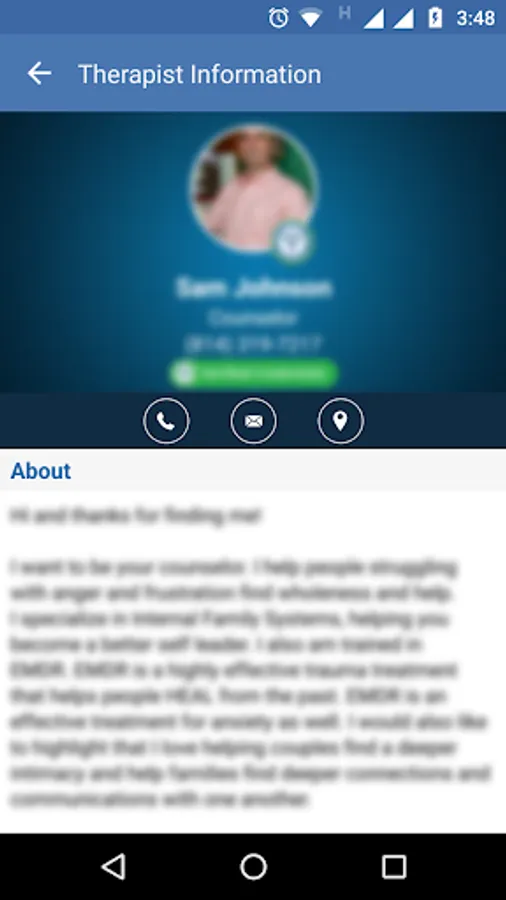 It also allows you to select a Therapist and view their detailed introductory narrative or locate them on the map and get turn by turn directions using Google Maps.