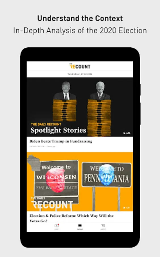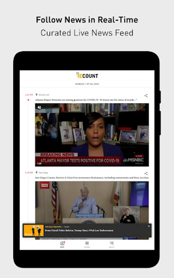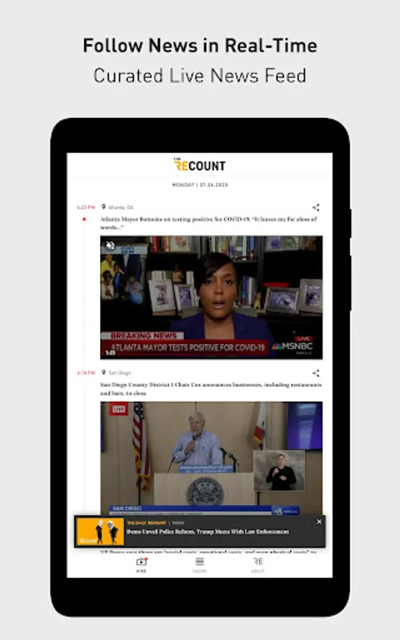 Start with the Recount Wire, a realtime feed of the most relevant video news updated throughout the day. The Recount Wire is a selection of live video footage from social media, local and cable news curated throughout the day by our editorial team. See and hear what our political leaders and government officials are saying as it happens.
