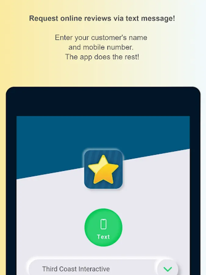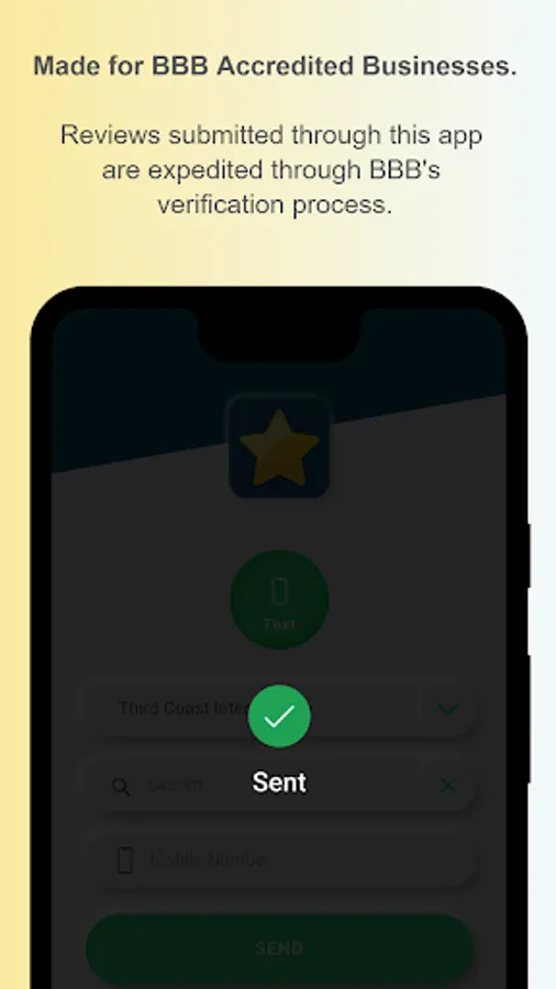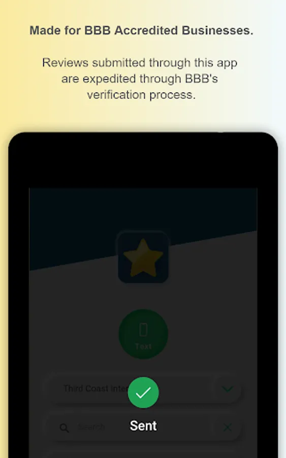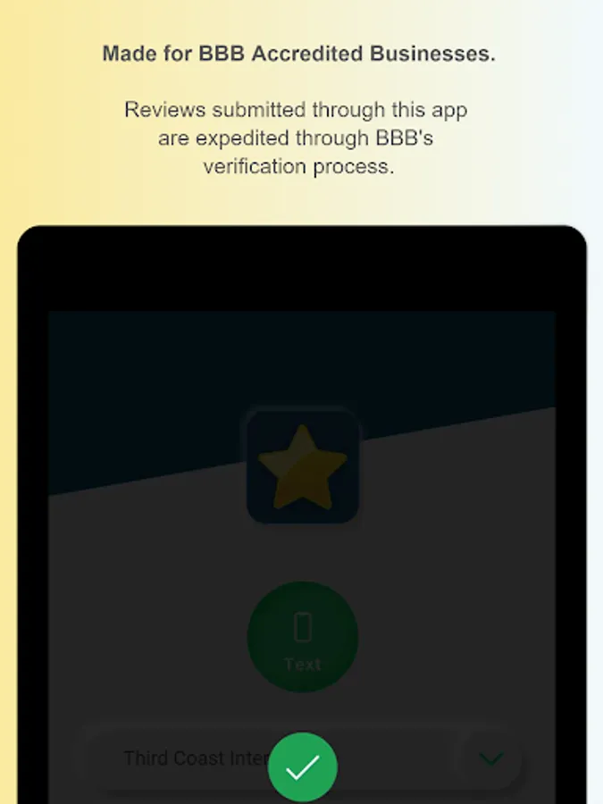 The Review Solution empowers Accredited Businesses in participating Better Business Bureaus to request customer reviews at the point of service. Through The Review Solution app, customers receive a text from the business and submit their review directly to Better Business Bureau (BBB). The customer review is pre-verified and, once it has been processed by the local BBB office, is published on the business's BBB Profile. Getting online BBB customer reviews is as easy as sending a text message.