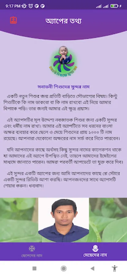 এই অ্যাপসটির মূল উদ্দেশ্য নবজাতক শিশুর জন্য একটি সুন্দর এবং ধর্মীয় নাম রাখা। আমার এই অ্যাপটিতে সব ধরনের বাংলা অক্ষর ব্যবহার করে ছেলে ও মেয়ে শিশুদের প্রায় 1000 টি নাম রয়েছে। আপনারা যেকোনো অক্ষরের নাম সার্চ করে