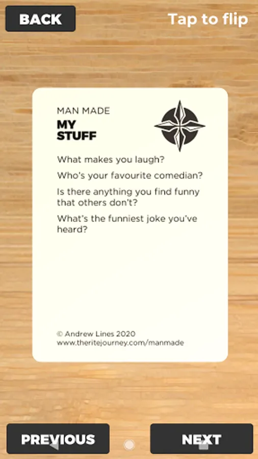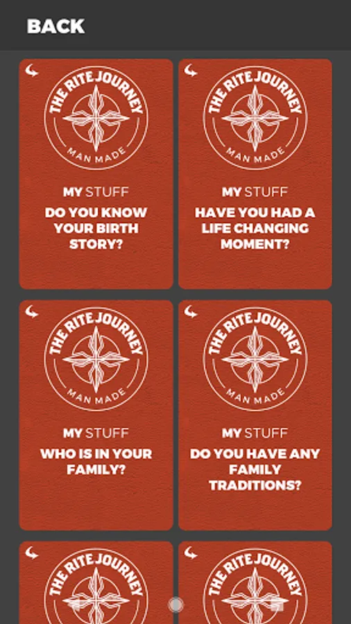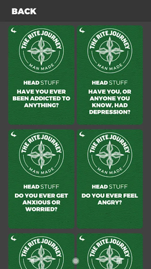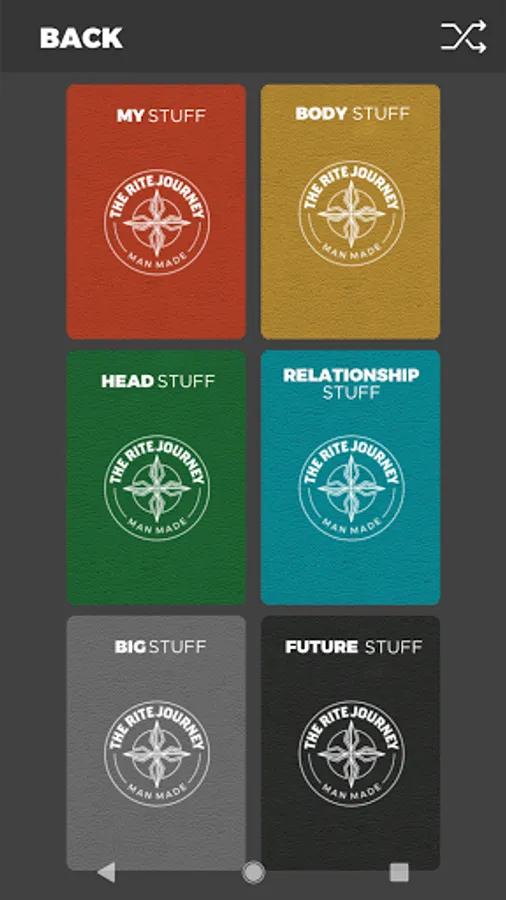 The Rite Journey Man Made App has been designed to foster conversations with males. They help men and boys tell their story through a set of 87 cards divided into six suits: My Stuff, Body Stuff, Head Stuff, Relationship Stuff, Big Stuff and Future Stuff.