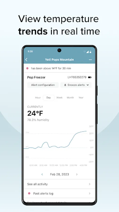 • Viewing real-time and historical temperature and humidity data, gaining insights into performance, and receiving, viewing or snoozing alerts