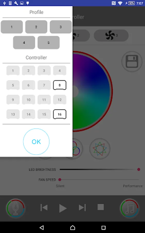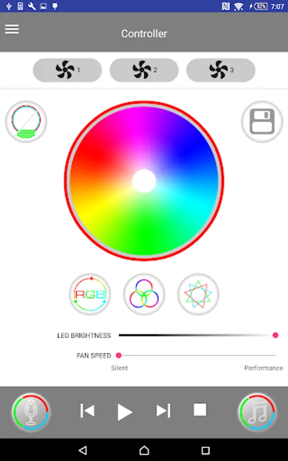 ● The “Color Palette” enables users to freely pick a color for the fans. Alternatively, users can choose “RGB Cycle” to switch to a 256 multicolored mode.