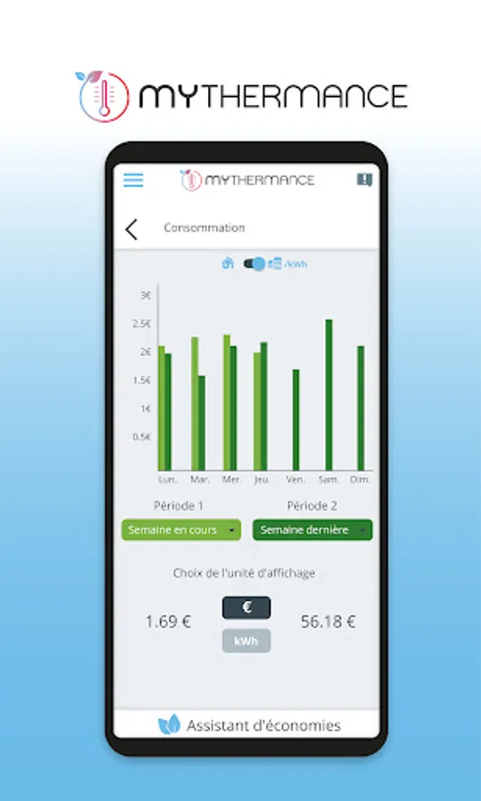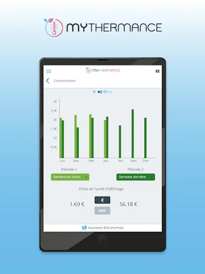 In a single gesture, consult the consumption of your home, according to 3 levels, with a vision MyThermance allows you to control, understand and analyze your consumption using simple and detailed graphs over a given period (day, week, month , year).