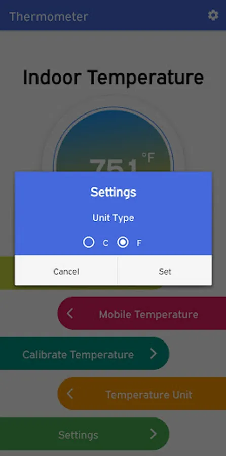 Thermometer Room Temperature Indoor, Outdoor and Room Temperature Meter app measure room temperature in unit type Celsius (°C), Fahrenheit(°F) and Kelvin (°K)