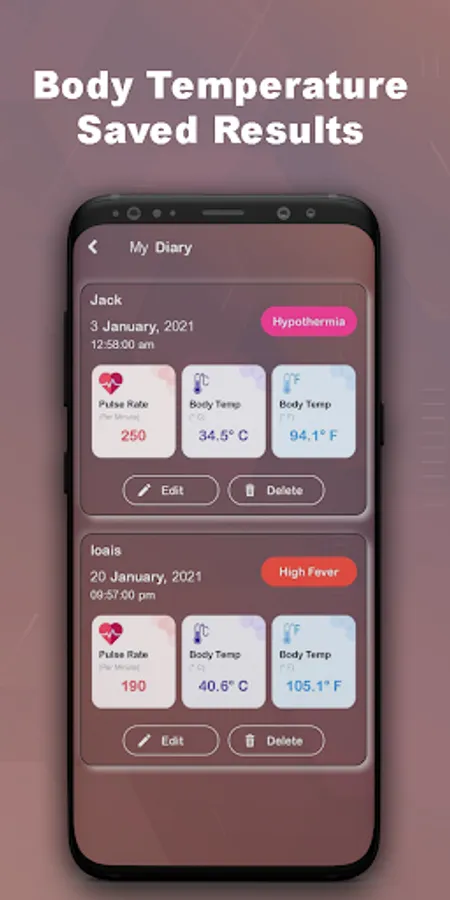 Thermometer for Fever Body Temperature Records Diary Measure App information, gives you the maximum & minimum range of the given values in the app to store the previous records and gives you the information about your body temperature which are given according to the thermometer.