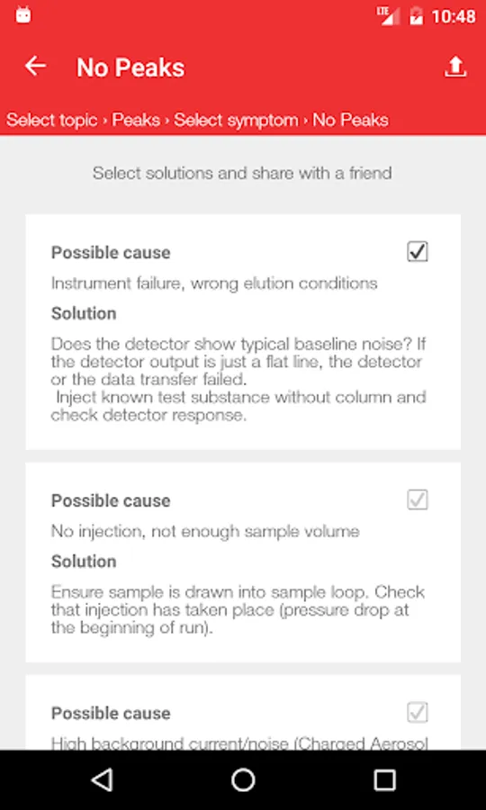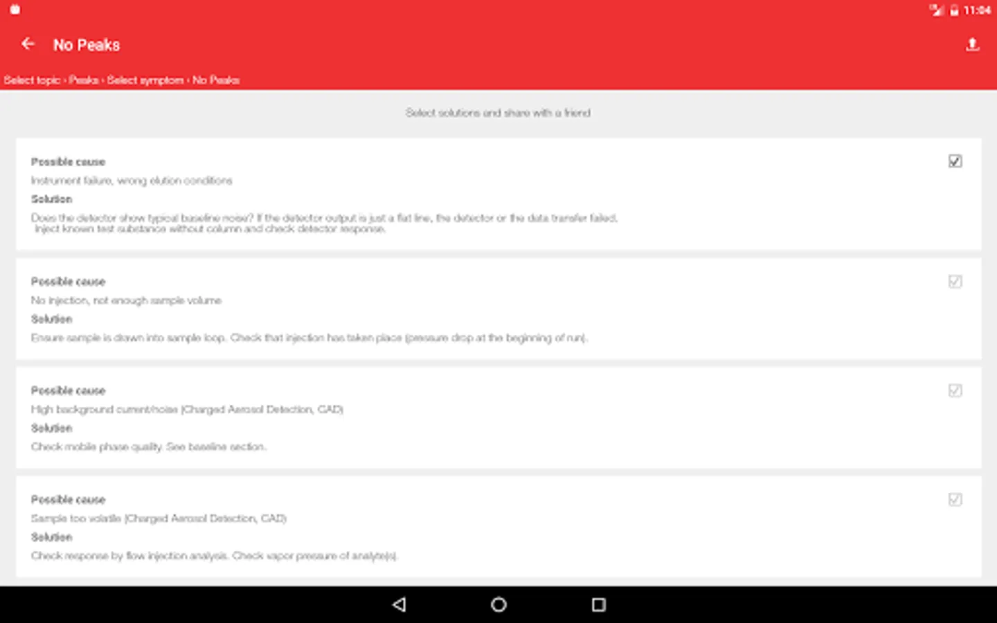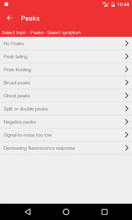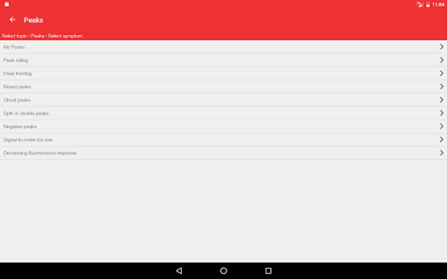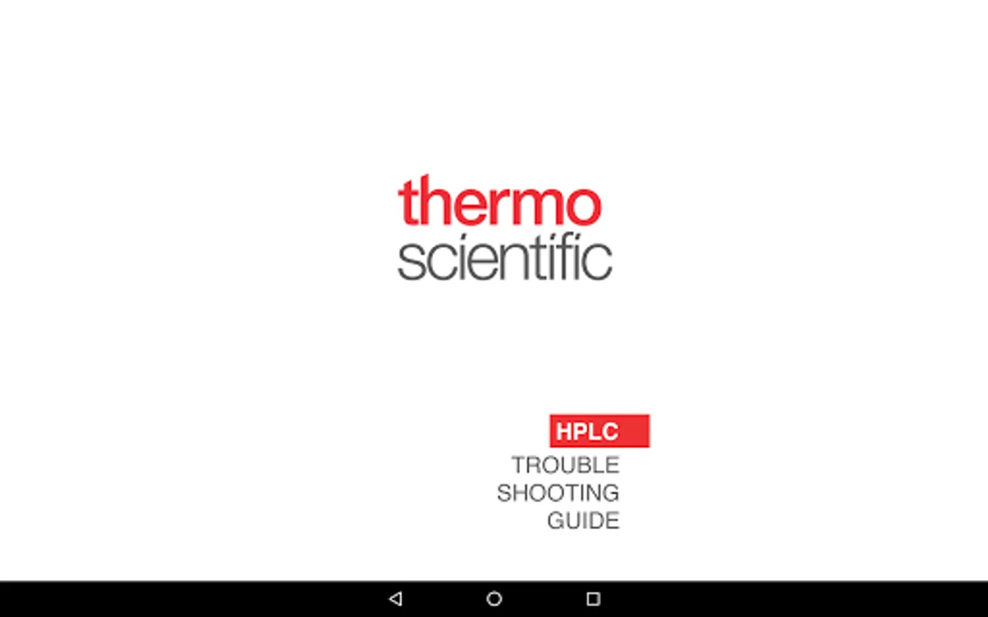 The Thermo Scientific HPLC Troubleshooting Guide App is an extensive tool to effectively diagnose various potential issues with HPLC analysis. Solutions range from general nature issues that are common to standard instrument setups from various manufacturers to troubleshooting special technologies such as nano LC, fluorescence, charged aazerosol and electrochemical detection.