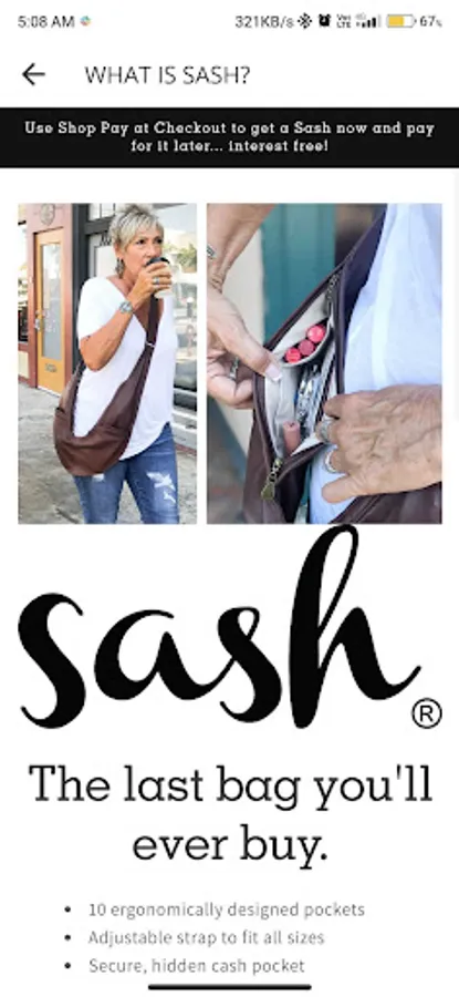 Sash bag is a patented cross body design that is different from any "purse" you've ever had. This organized, ergonomic bag allows you to be hands-free and comfortable while carrying all of your essentials. Carry everything you need in a system of 10-pockets that are secure and comfortable. When we say this bag can change your life, we're not exaggerating!