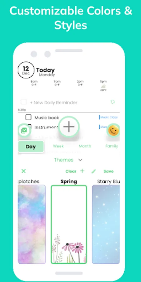 Choose from many different colorful themes, and set your preference for event styling and sizes on the calendar.