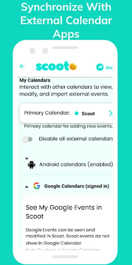 Scoot integrates smoothly with iOS calendar and Google calendar for families that need to keep using a combination of calendars. You can even import your other calendars into Scoot so it’s easier to manage everything from one place.