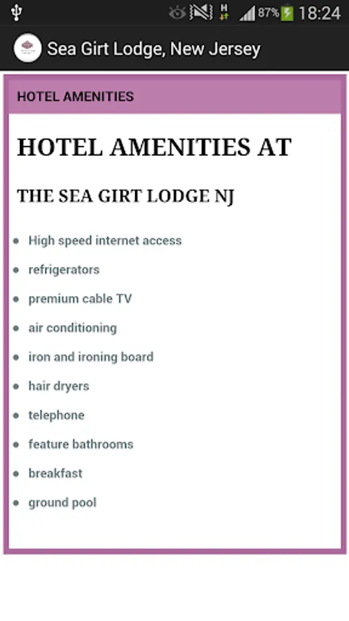 Connect now with the Sea Girt Lodge, a Sea Girt, NJ hotel that welcomes your business. You can reach this property easier and quicker than ever before with the hotel’s app from BingoTravel Apps. It’s never been more convenient to reach this independent property than with this single property app. You can see hotel features, enticing amenities and look over helpful images anytime you like. Of course, direct booking is available now or when you want it with this app. Anytime you need it, it’s is here for you. To reach this hotel, simply download this app now.