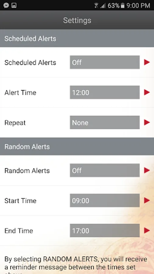 Key features include scheduling specific times for alerts, selecting time frames for random alerts, bookmarking, and sharing.