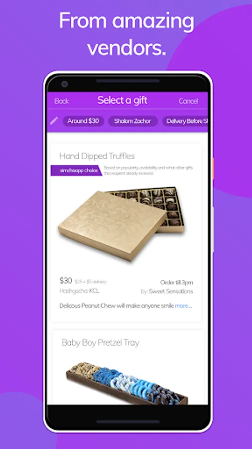 TheSimchaApp is the easiest way to buy gifts for your friends Simchas. There’s no need to call a store, or lay out money for a group gift. With TheSimchaApp you can just tap to purchase a gift from your favorite store, or create a link for your friends to join in a group gift. No collecting money, credit card numbers or any of the traditional hassle.