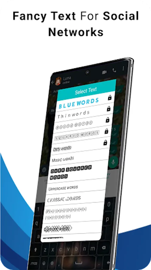 The app includes custom keyboard that allows the user to customize the text style or font style of keyboard. Attractive and amazing font style keyboard allow the user to change keyboard themes, keyboard text style and can also use emoji keyboard. Stylish font style keyboard allows the user to type faster with attractive and smart 100+ font styles on WhatsApp. Interactive keyboard layout allows the user type letters as well as use EMOJIS, in different apps social media and other apps. Keyboard fonts and Keyboard layout is designed in order to make typing easier and faster. The blueword stylish font keyboard is an amazing tool that can help the user to type in an interactive and quick manner. Keyboard layout is user friendly and colorful. A wide variety of font styles allows the user to type their content and share their writing with innovative styles on different social media apps.