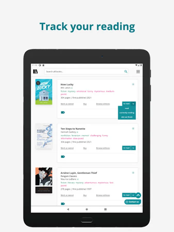 Custom Tags: Enhance your book tracking and discovery by making use of our custom tags feature. You can search and filter books by your tags and share curated lists with friends.