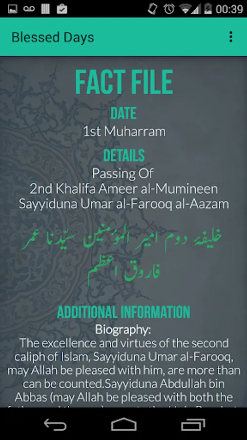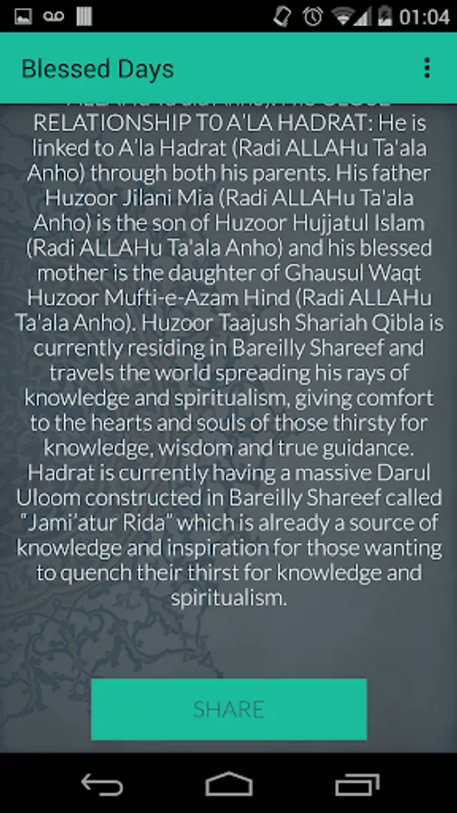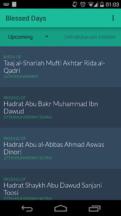 Alhamdulillah, launched on the 71st birthday of one of the greatest scholars alive today, Taajush Shari'ah Mufti Akhtar Rida Khan, TheSunniWay presents the "Blessed Days" Android Application. This app allows you to see current/upcoming important events in Islam, such as important days, nights and Urs/Birth dates of the Awliya. The aim of this app is to increase our spiritual connection to our pious predecessors by making Fatiha and learning about them through this app, which in sha Allah will be a means towards them interceeding for us in the hereafter!