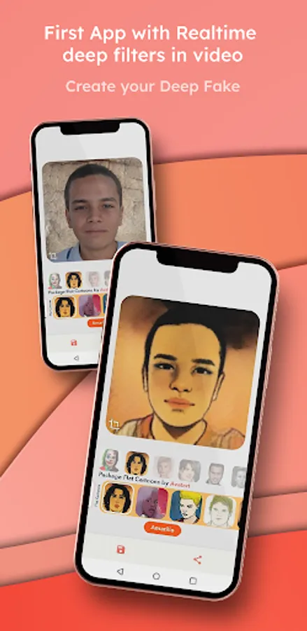 With AvatART, the avatar face morph, you can turn into a cartoon of yourself in realtime with the power of our AI face filters alter ego. We do not use the típical and widely spread alter ego, loomie, artbreeder or StyleGAN models and transformations, our caricature maker is genuine and is handmade created by us to give you unique results not reachable by any other avatar face morph realtime app in the market.