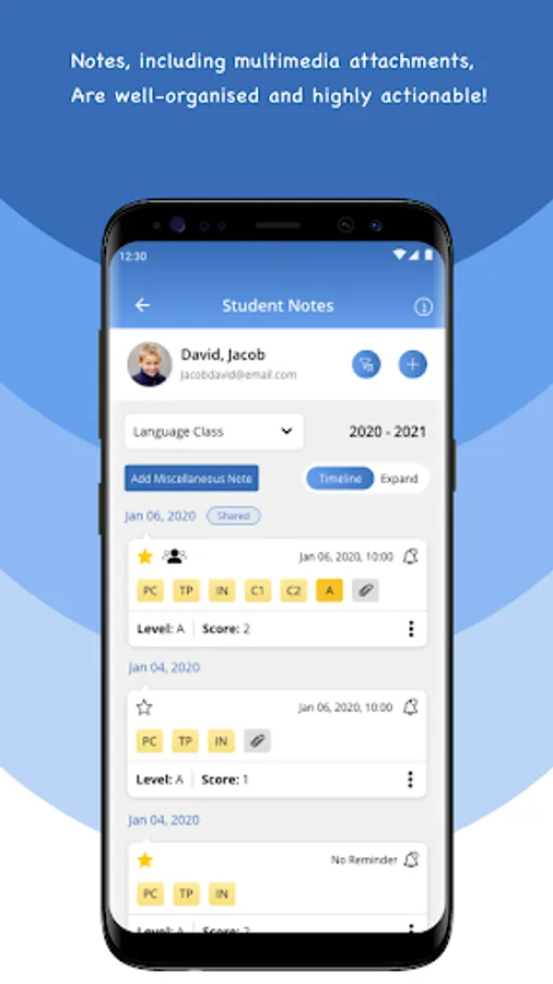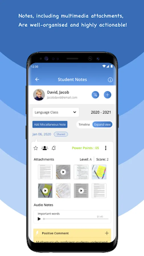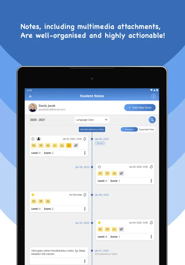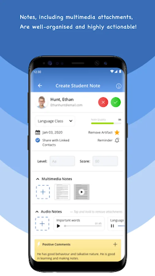 Customize notes ー the number of text fields (from 1 to 5) and their labels (i.e. - “Next Steps”, “Teaching Point”, etc.)