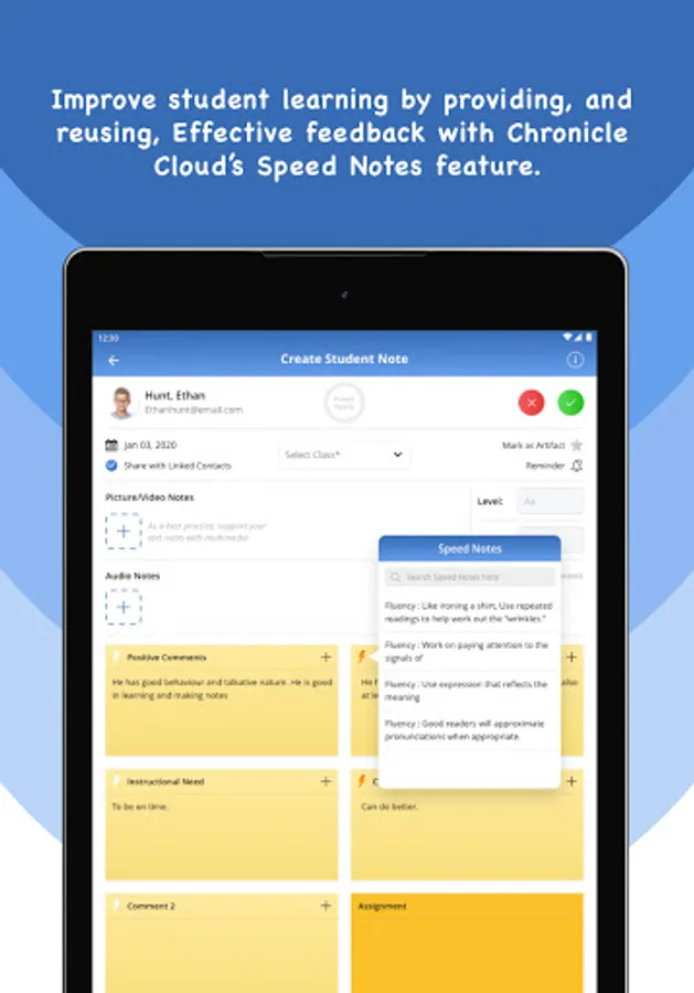 Chronicle Cloud is a versatile app for teachers across all subjects. Designed to help teachers maximize student success, Chronicle Cloud aids teachers in note-taking (conferring and/or anecdotal), team teaching, formative assessments, managing groups, optimizing assessment data, and much more!