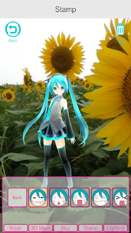 ・5 preset facial expressions are available.You can also customize her eyebrows, eyes and mouth. After placing the 3D model, you can fix Hatsune Miku's gaze towards the camera.