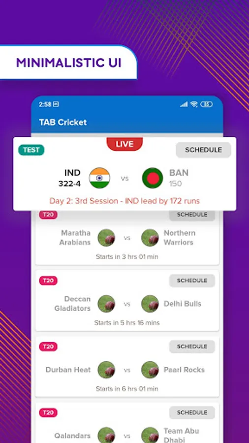 TAB Cricket also provide perfect cricket scorecard with fastest updating ball by ball cricket commentary. User also get details about playing 11 squad from about page of match. User will get notifications regarding match updates like Lineup, Toss, Wicket, Fifty, Hundred etc.