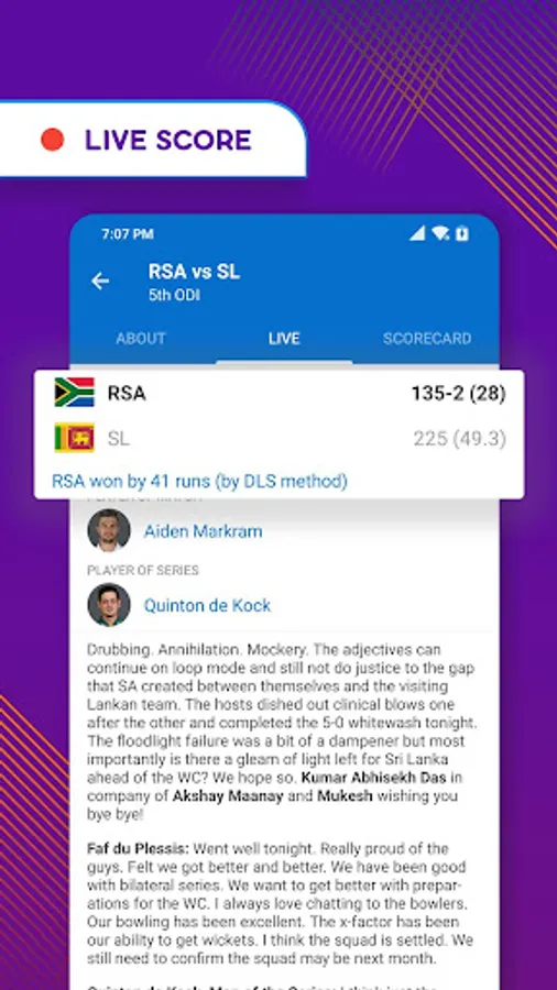 First in Google Playstore, You got the complete ad free app for Cricket fans to catch live scores and schedules of world cricket and domestic cricket as well.