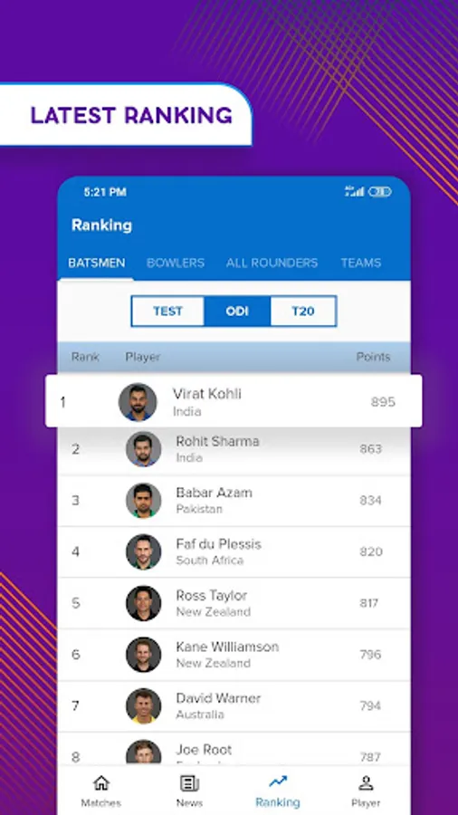 Cricket formats like T20, ODI and Test ranking also available for Batsman, Bowler, All-rounder and Team.