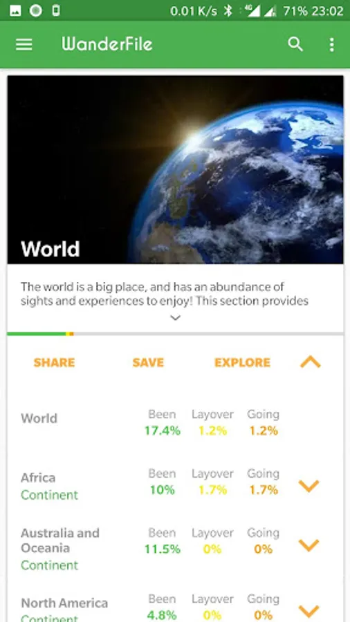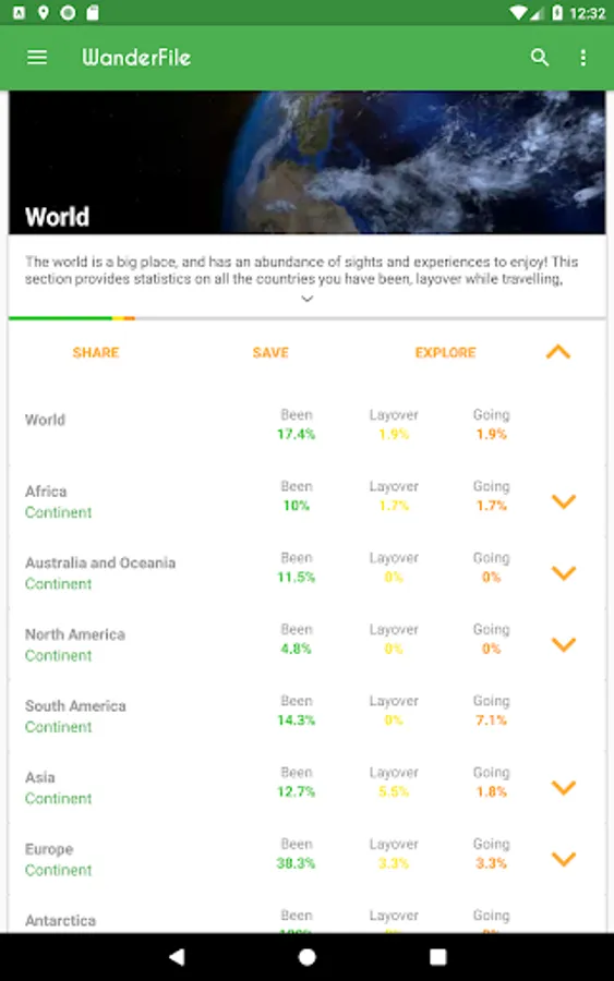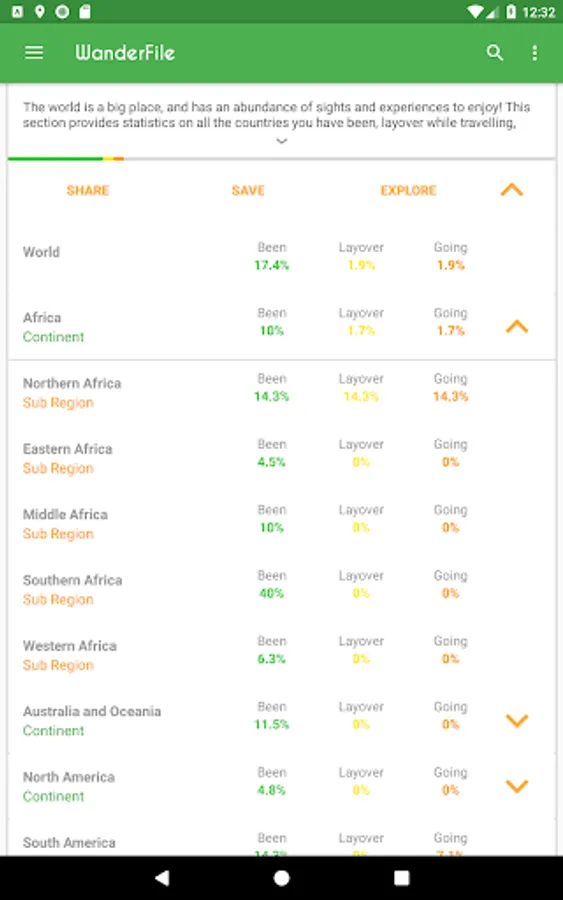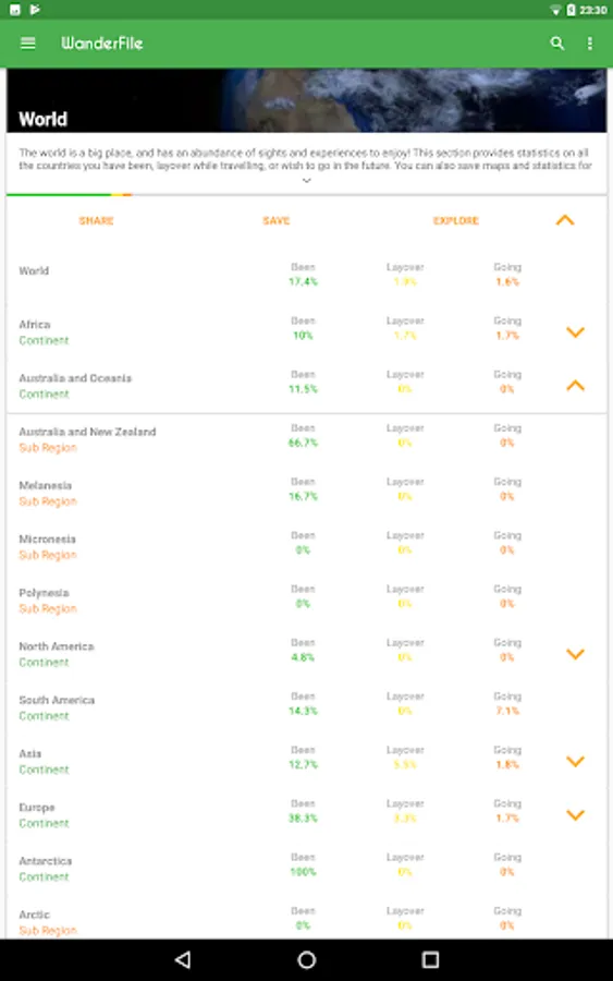 Once you have entered the countries you have been to, either through the provided lists, maps or search; you can then review the percentage of the World, continents and sub regions you have visited in the summary section contained in the drop down area of the World section on the front page.