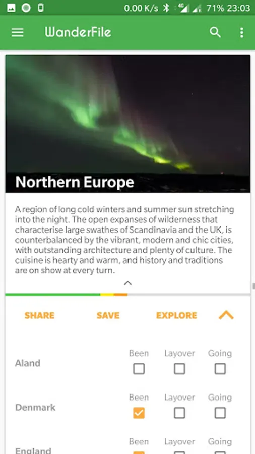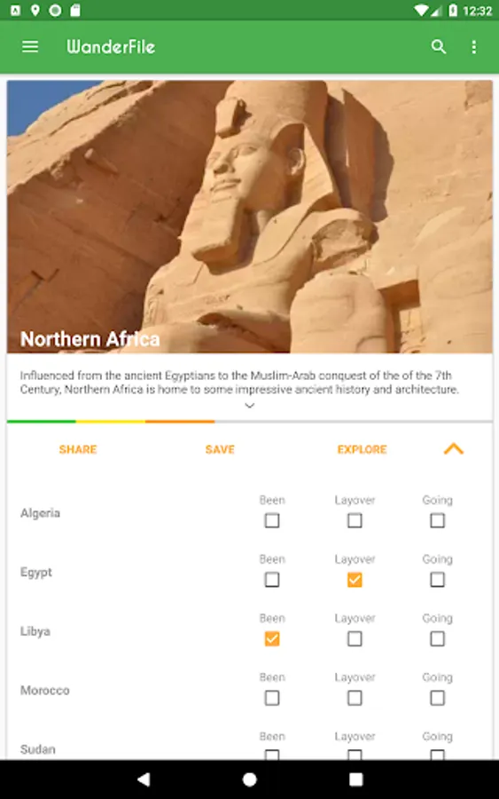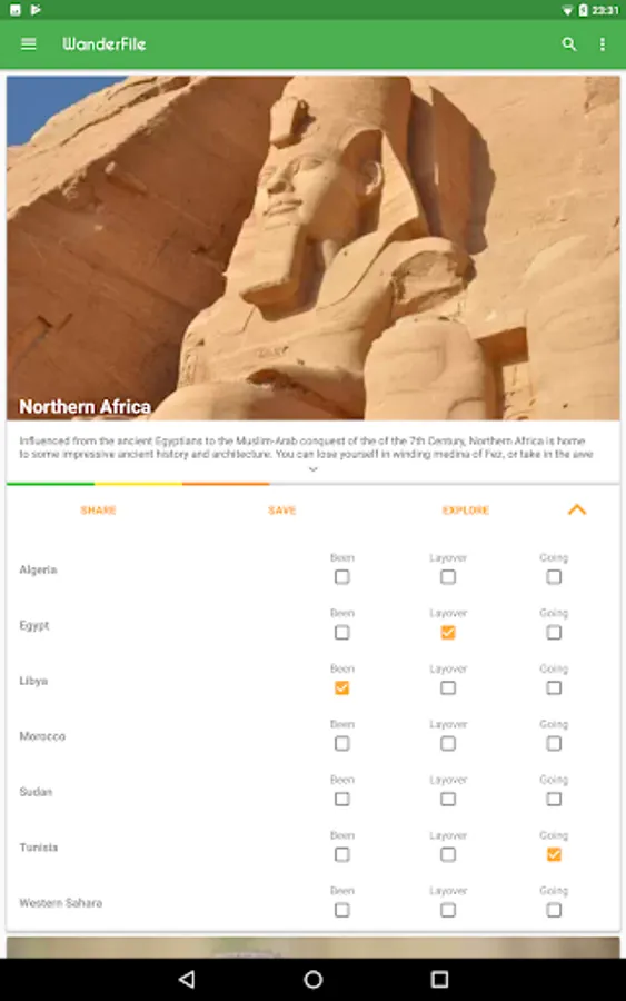 Wanderfile allows you to select the places (countries, regions of countries and cities) you have been, layover on a flight or want to go in the future via interactive maps, organised lists or search. It also contains information for each country detailing typical costs, essential travel information and general interesting facts.