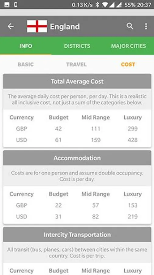 Each section includes costs for three different budgets: Budget, Mid Range and Luxury. The app will also display all costs in both your home currency and the local currency, so you can get a grasp of conversion rates before hand.