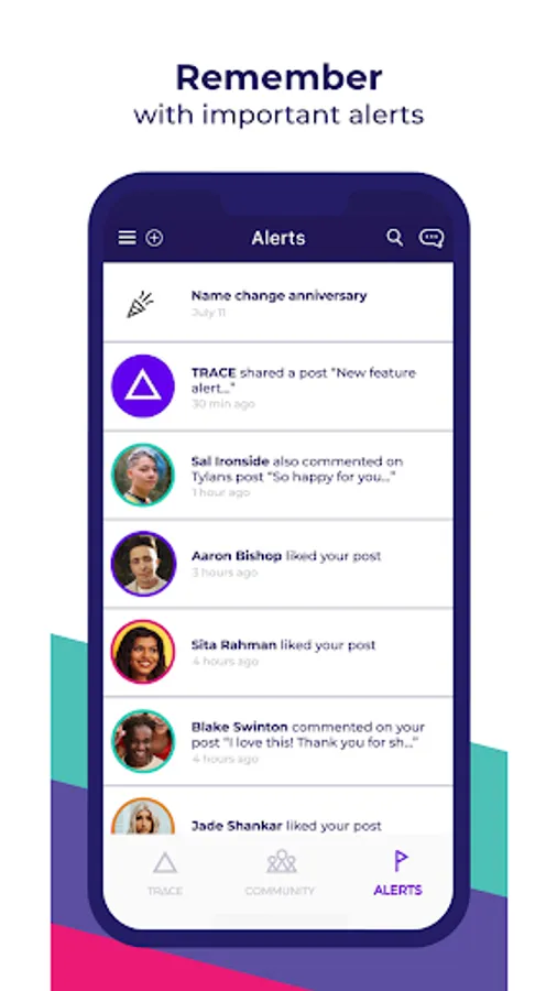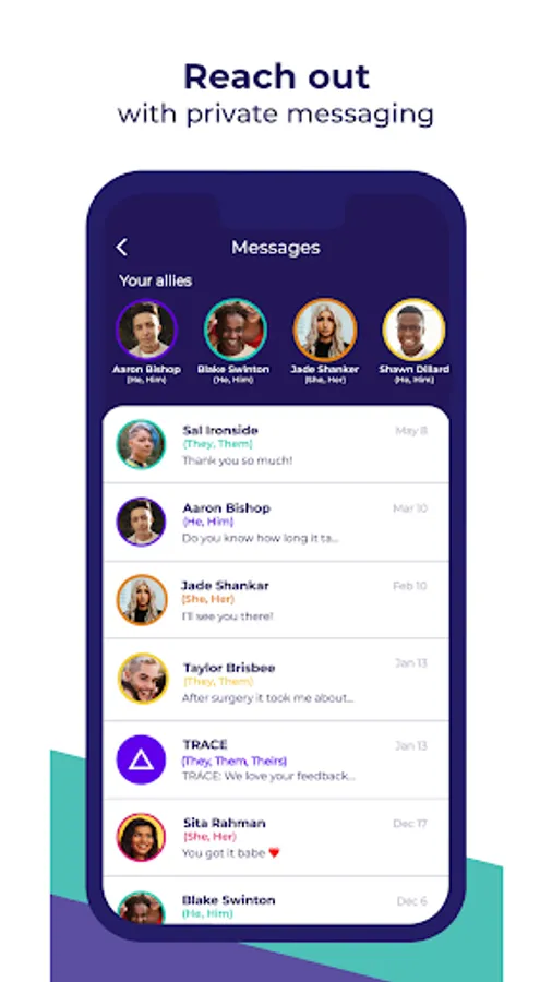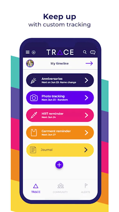 TRACE is a mobile application created to foster a brighter and more gender-affirming future for transgender and non-binary individuals. TRACE seeks to provide those in transition, a place to document and celebrate their journey among a trusted community of allies.