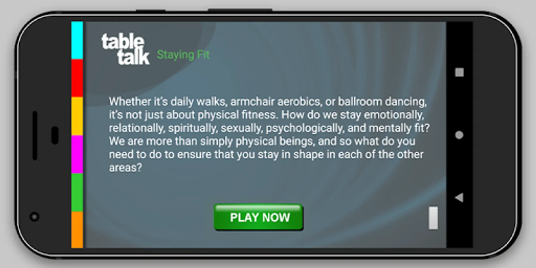 Table Talk aims to provide a fun way in which people can begin to have conversations about the important questions in life. Table Talk for Third Agers is for the early-retired who are looking to get together with friends. Every Table Talk game has 6 themes, with 16 questions exploring each theme.