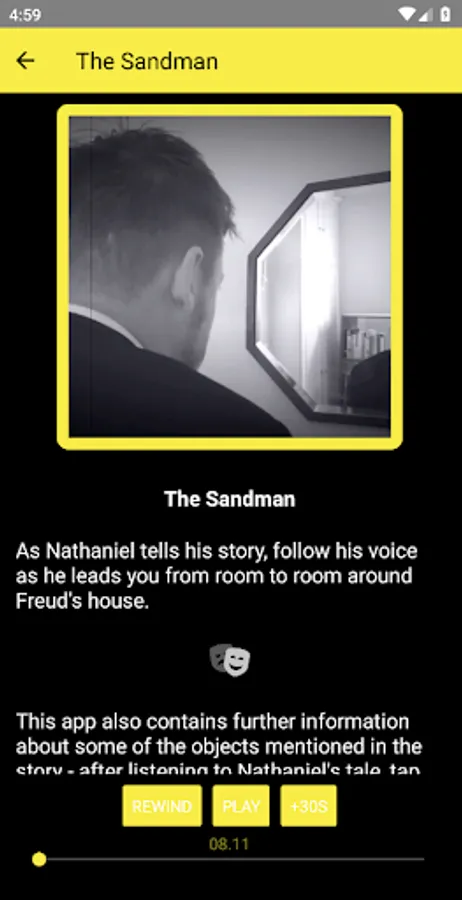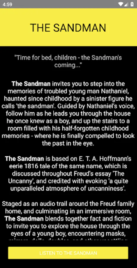 The Sandman invites you to step into the memories of troubled young man Nathaniel, haunted since childhood by a sinister figure he calls 'the sandman'. Guided by Nathaniel's voice, follow him as he leads you through the house he once knew as a boy, and up the stairs to a room filled with his half-forgotten childhood memories - where he is finally compelled to look the past in the eye.