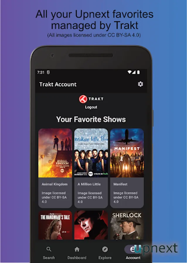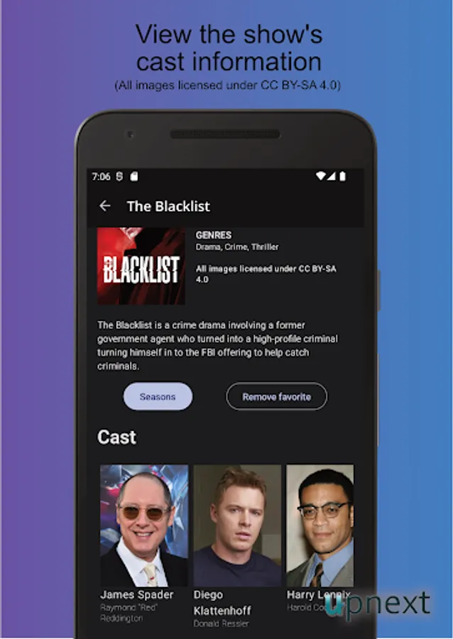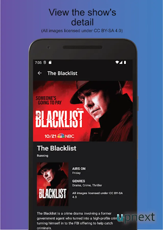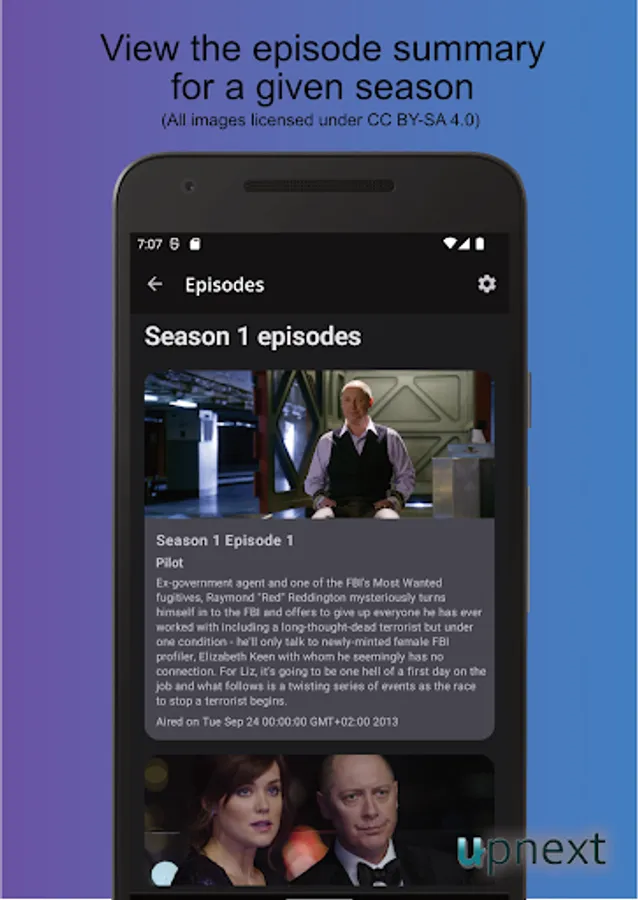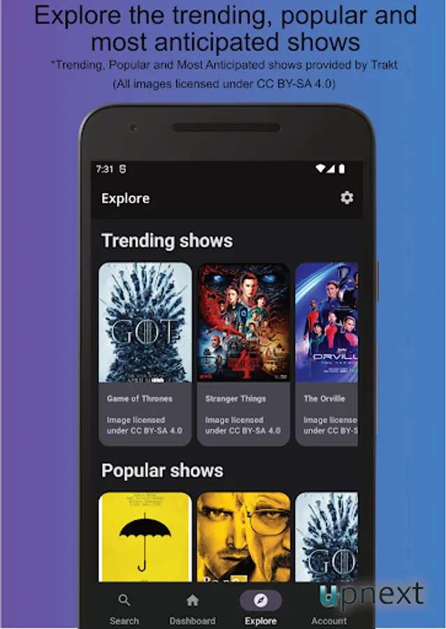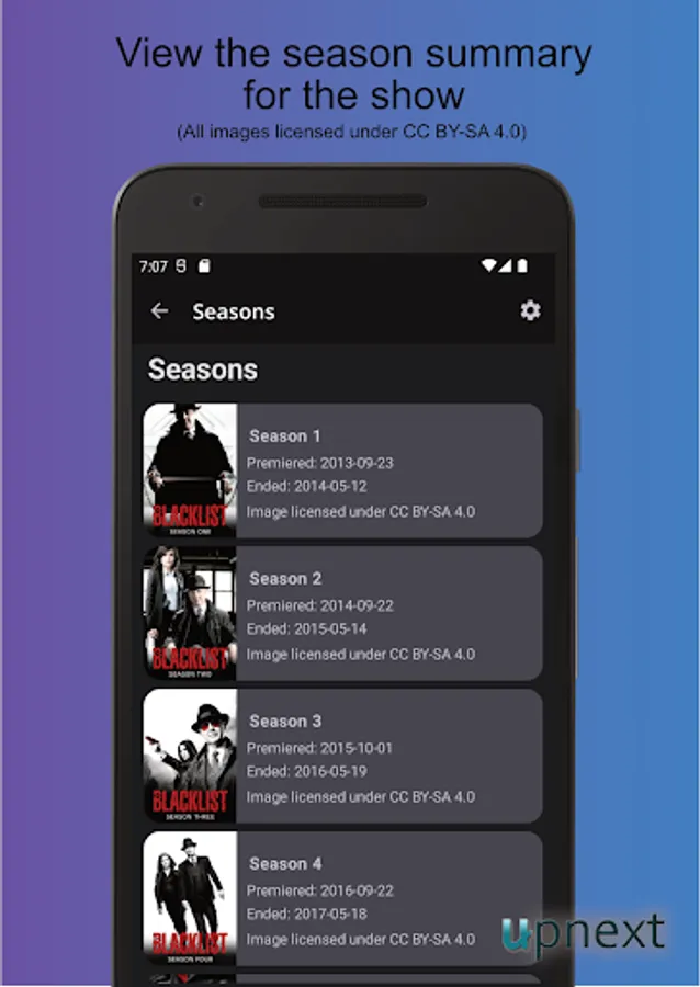 All data within the UpNext app is provided by TV Maze's API. The use of the API is licensed by Creative Commons BY-SA 4.0. All poster images/artwork for the shows are licensed under the Creative Commons BY-SA 4.0.