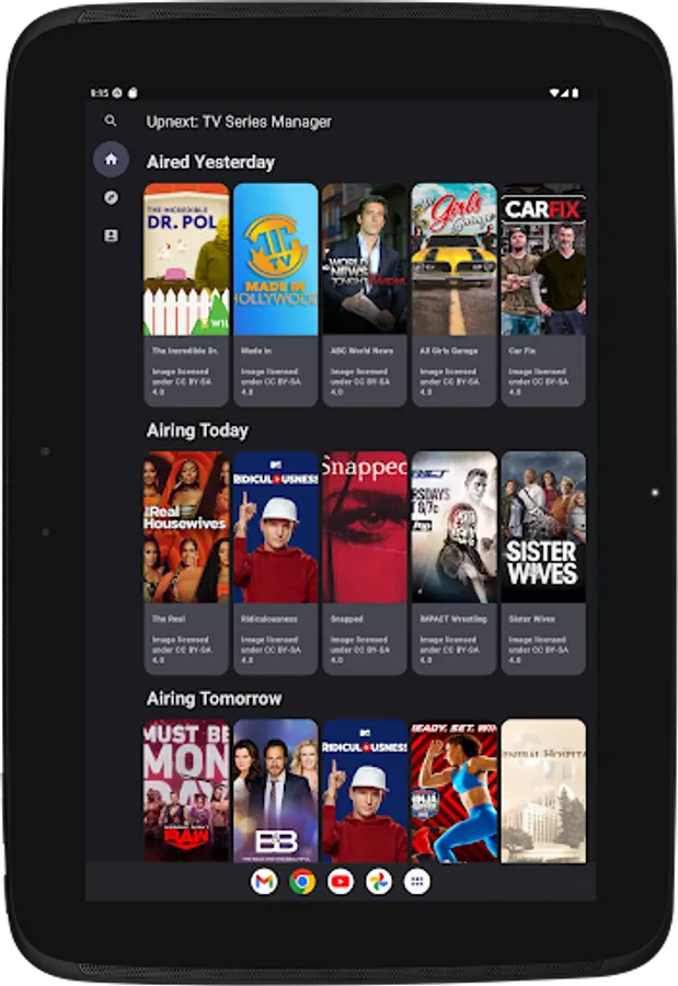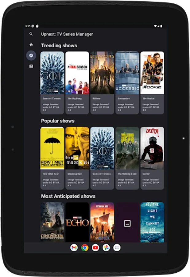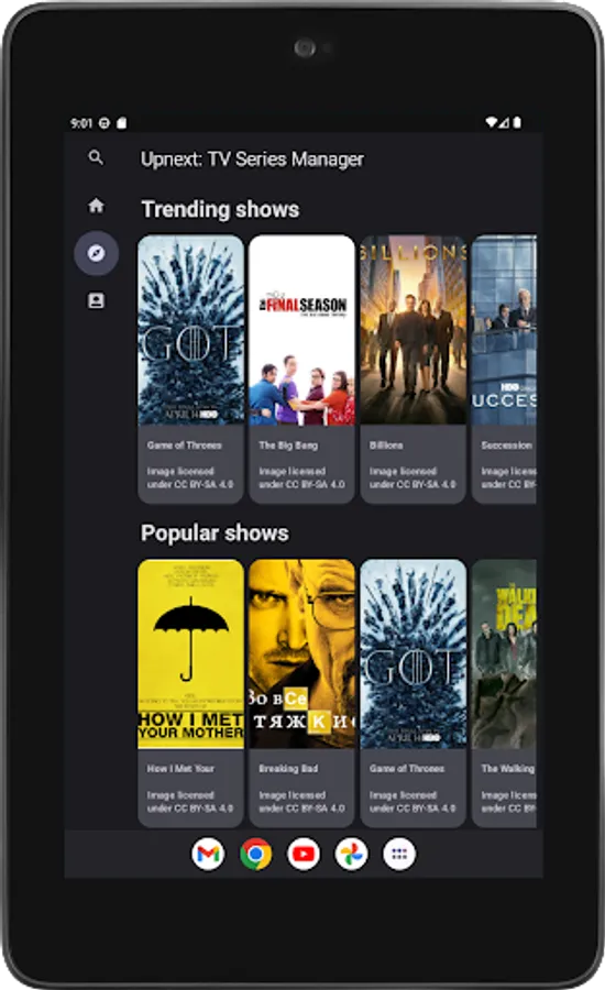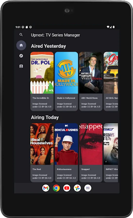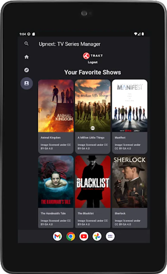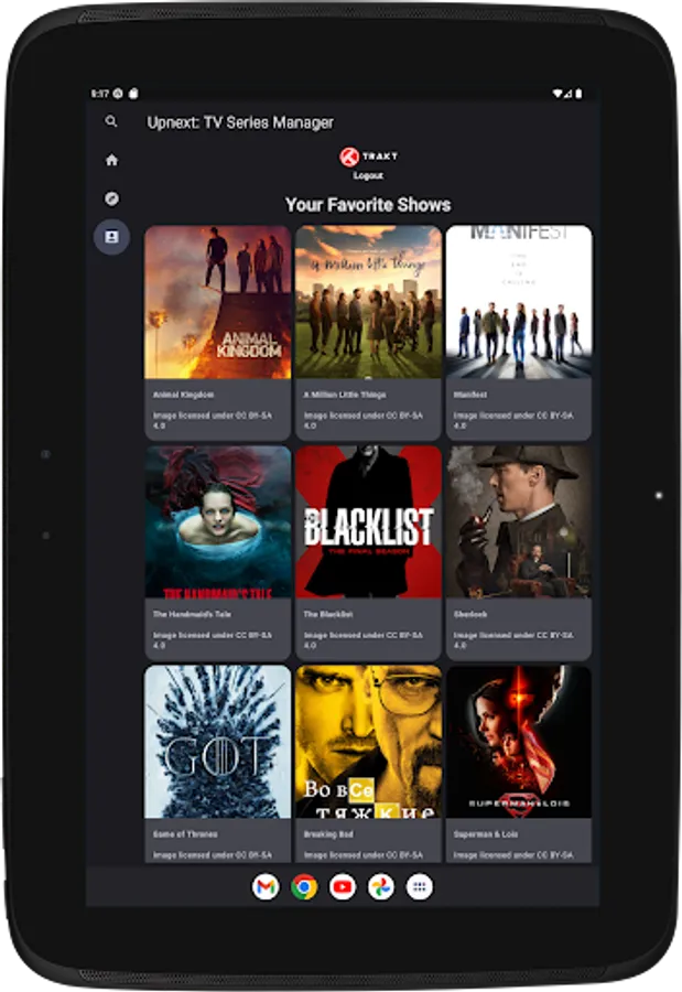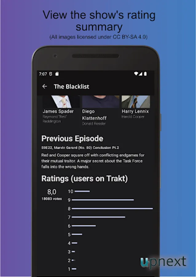 All data within the UpNext app is provided by TV Maze's API. The use of the API is licensed by Creative Commons BY-SA 4.0. All poster images/artwork for the shows are licensed under the Creative Commons BY-SA 4.0.