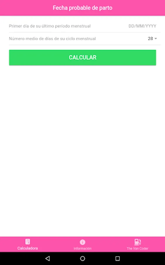 Using this application is very easy. Once you open the application you will see a form in which you have to enter the two data requested: the first day of your last menstrual period and the average number of days in your period.