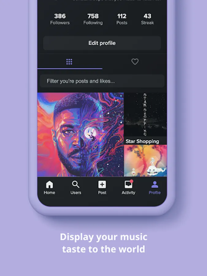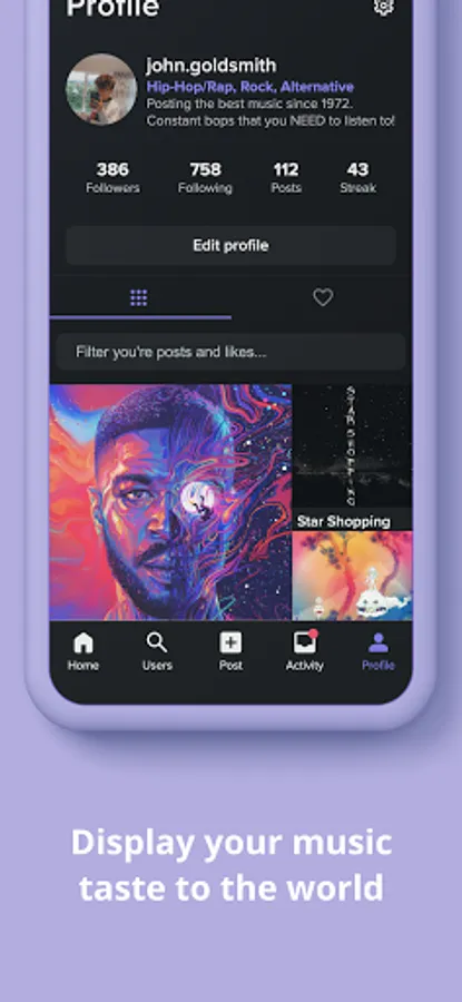 - Share your music taste to the world in your profile where you can edit your top genres and bio.