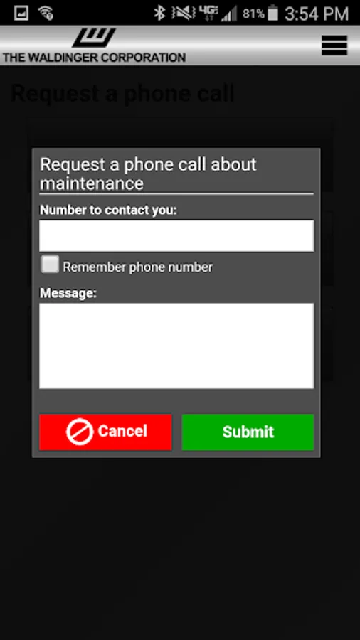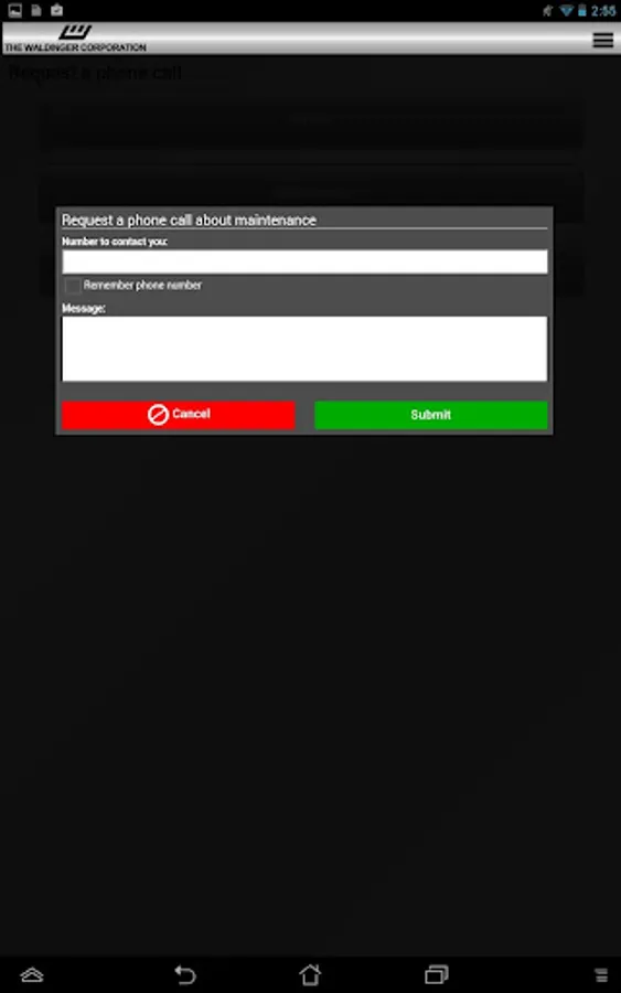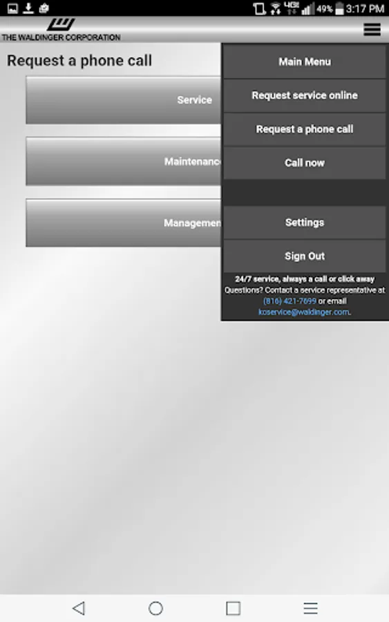 Through our app a customer may enter and submit a service request without needing to place a call If a phone call is necessary, the app provides a quick link to request a return phone call for anything related to service, maintenance or management. Also for those using the app on a mobile phone, a link provides the option for users to call their branch directly for immediate assistance.