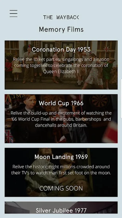 1953 – Relive the day of the Queen’s Coronation as neighbours got together for street parties across the UK. Nine short films, packed with thousands of memory triggers, recreate the music, fashion and conversations of the era.
