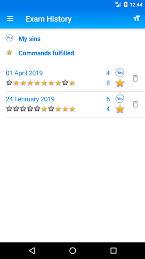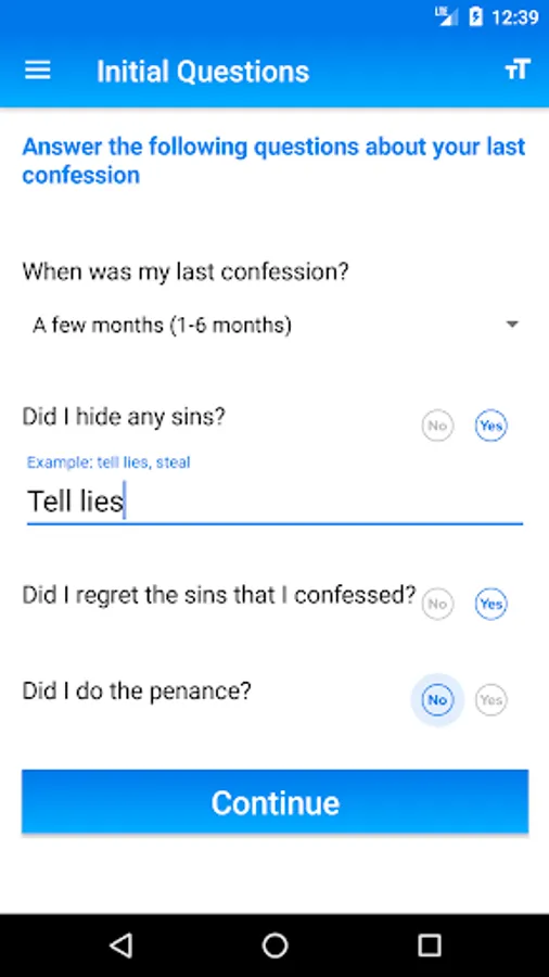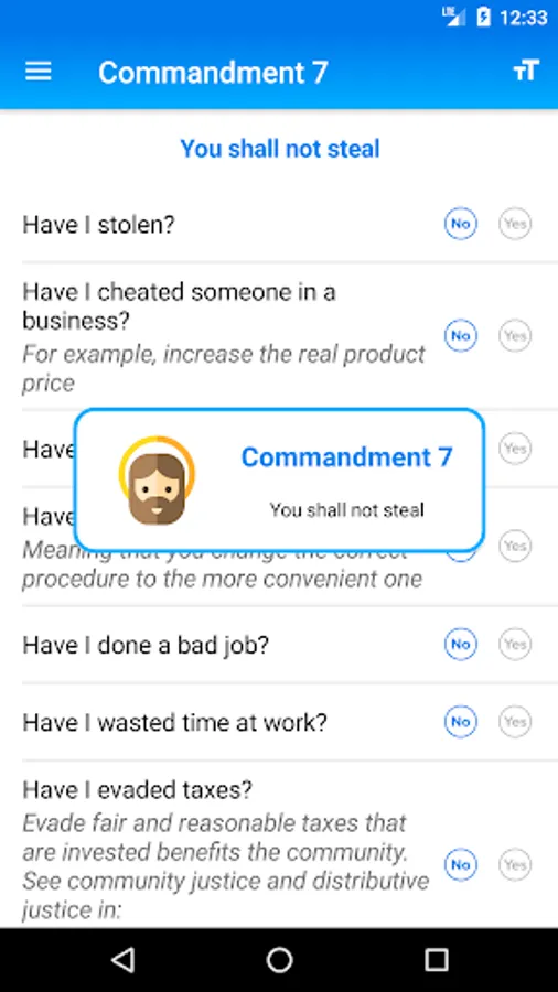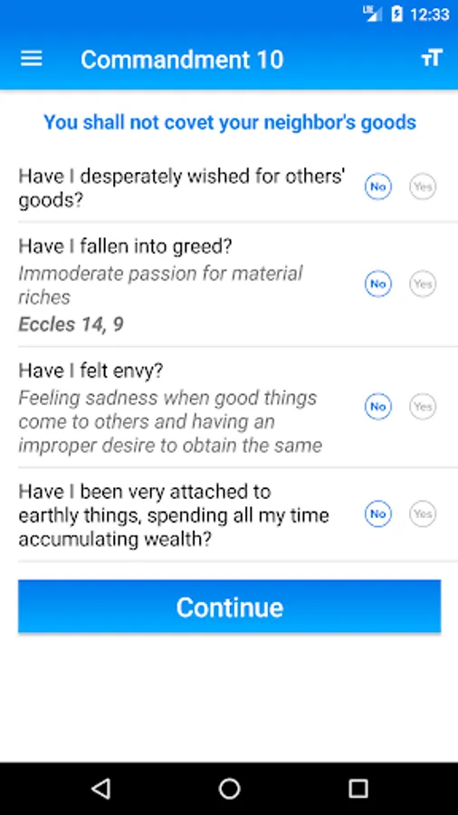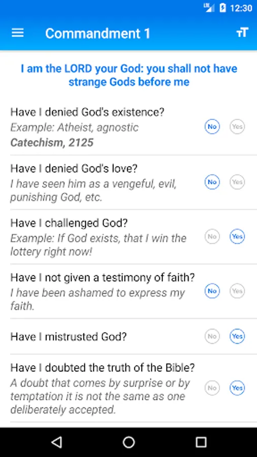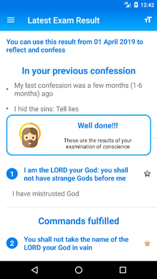 Reconciliation is the application that allows you to perform a complete examination of your conscience through a series of simple questions related to each of the commandments allowing you to obtain a clear vision of the faults committed according to the Bible and the commandments according to God´s law. Once the exam is completed the result is saved and can be easily retrieved for reflection and to serve as a guide in your next Catholic confession.
