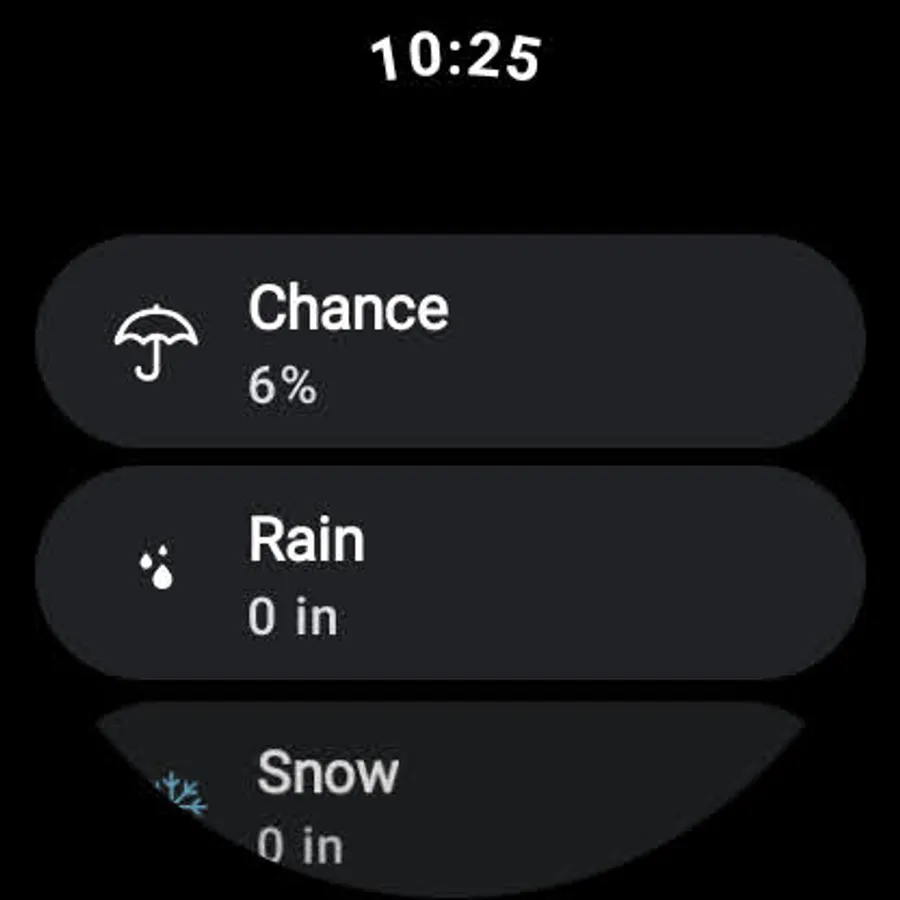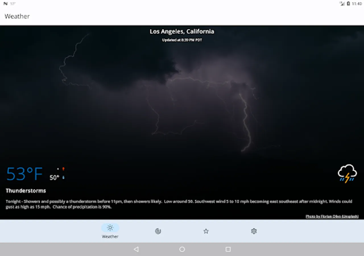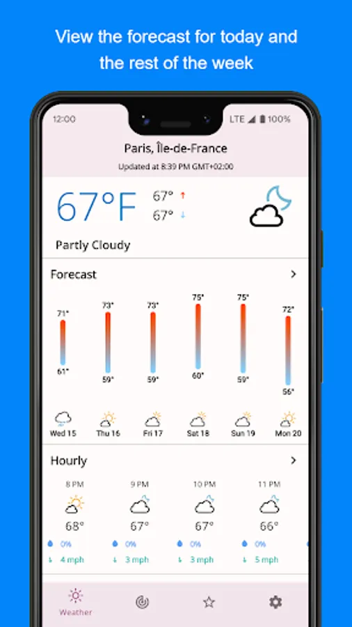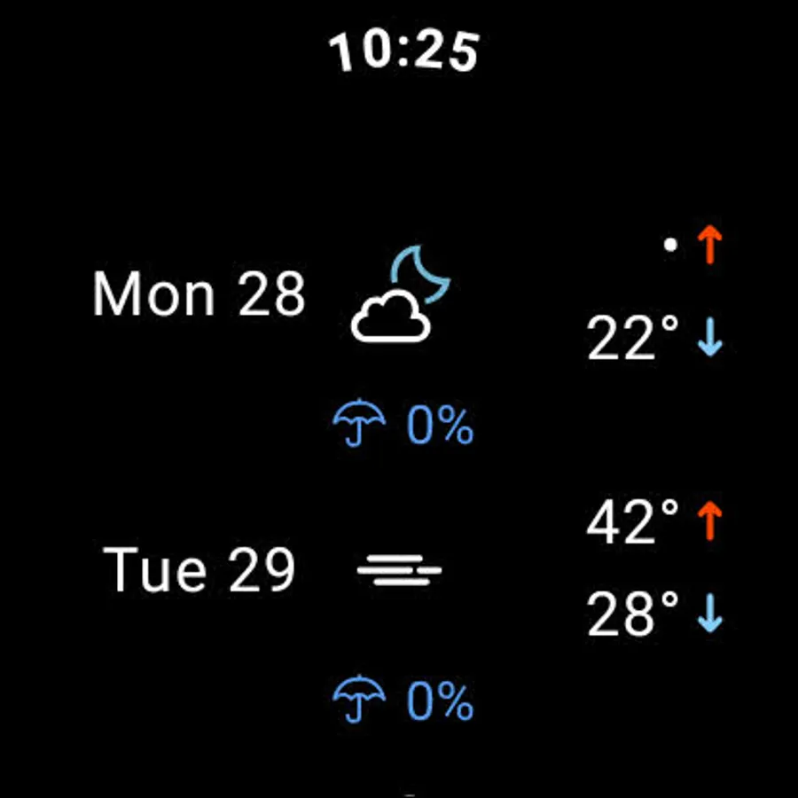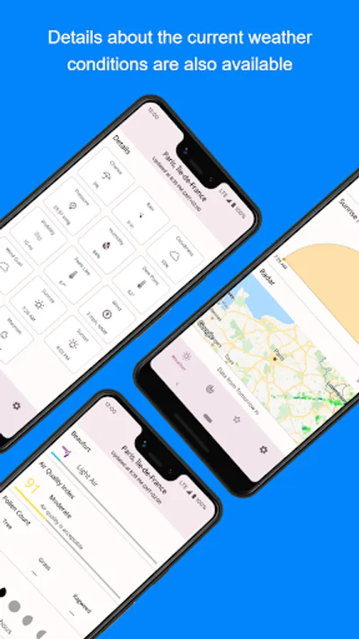 • Display other useful details: pressure, humidity, wind conditions, sunrise and sunset times