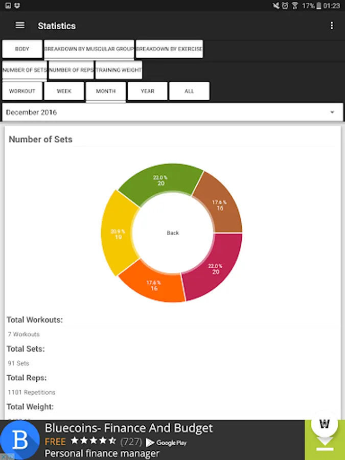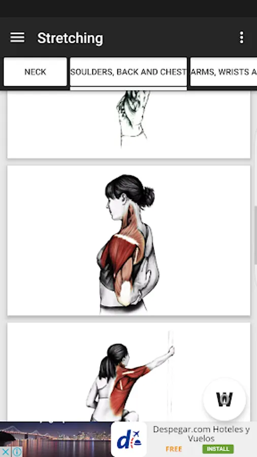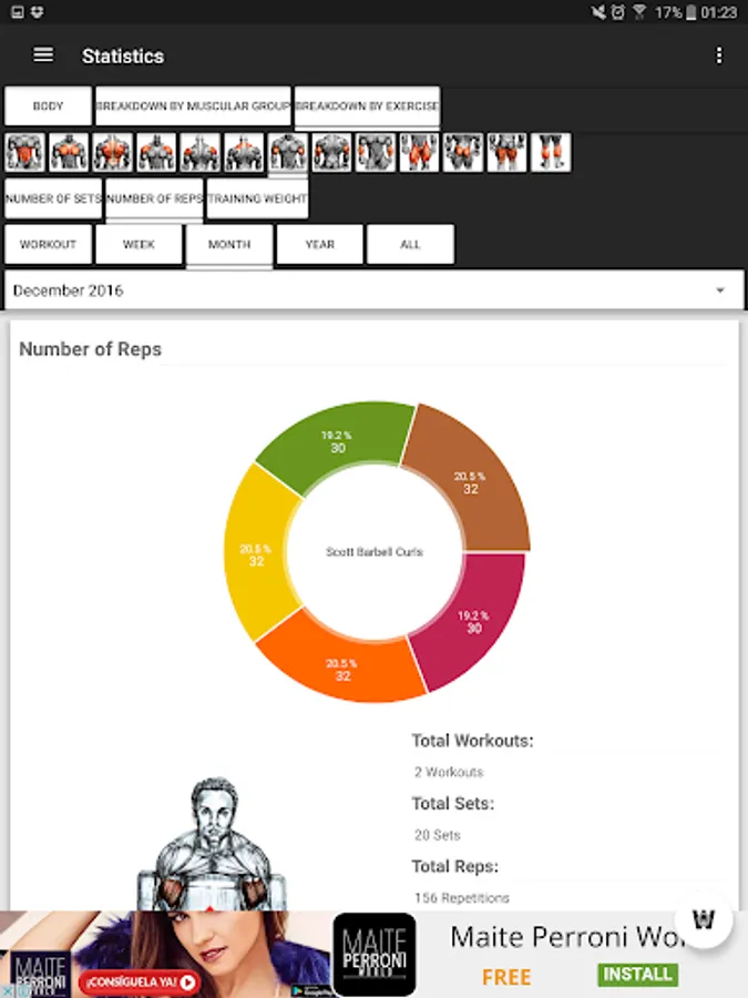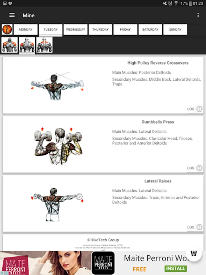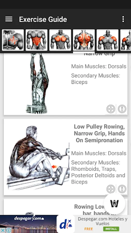 More than 175 different exercises organized by muscular groups with clear Images, explanation of the exercise, information about involved muscles, videos, etc.