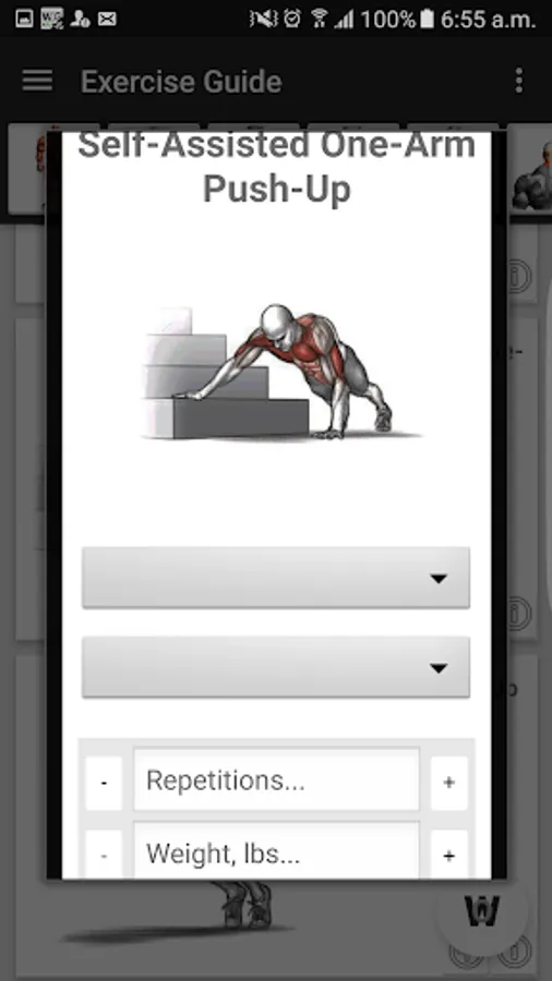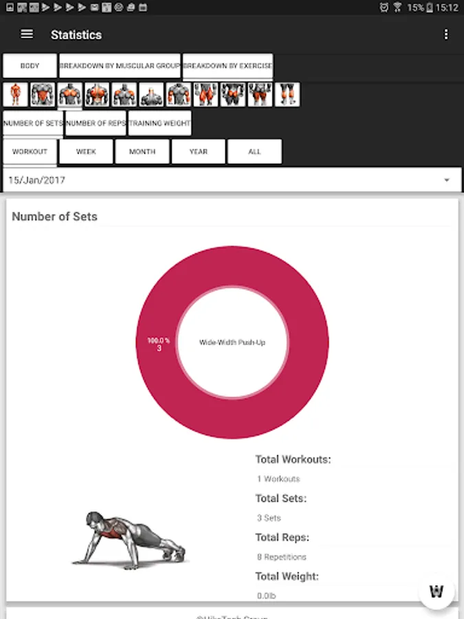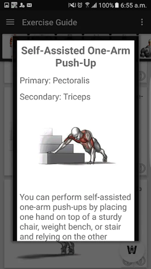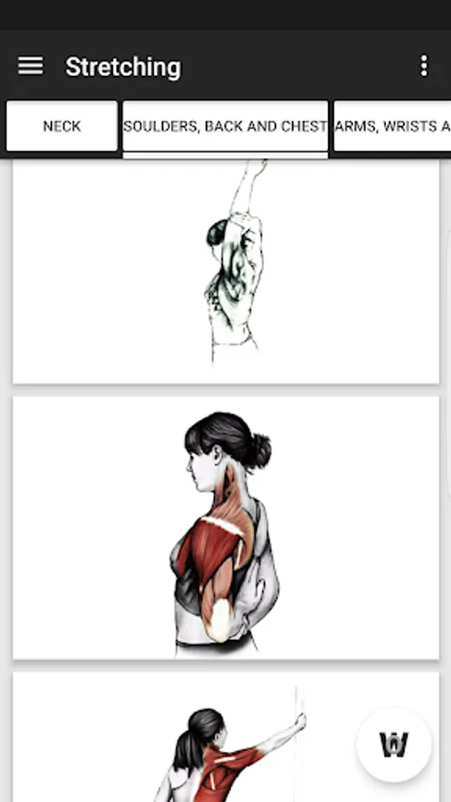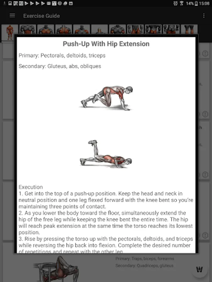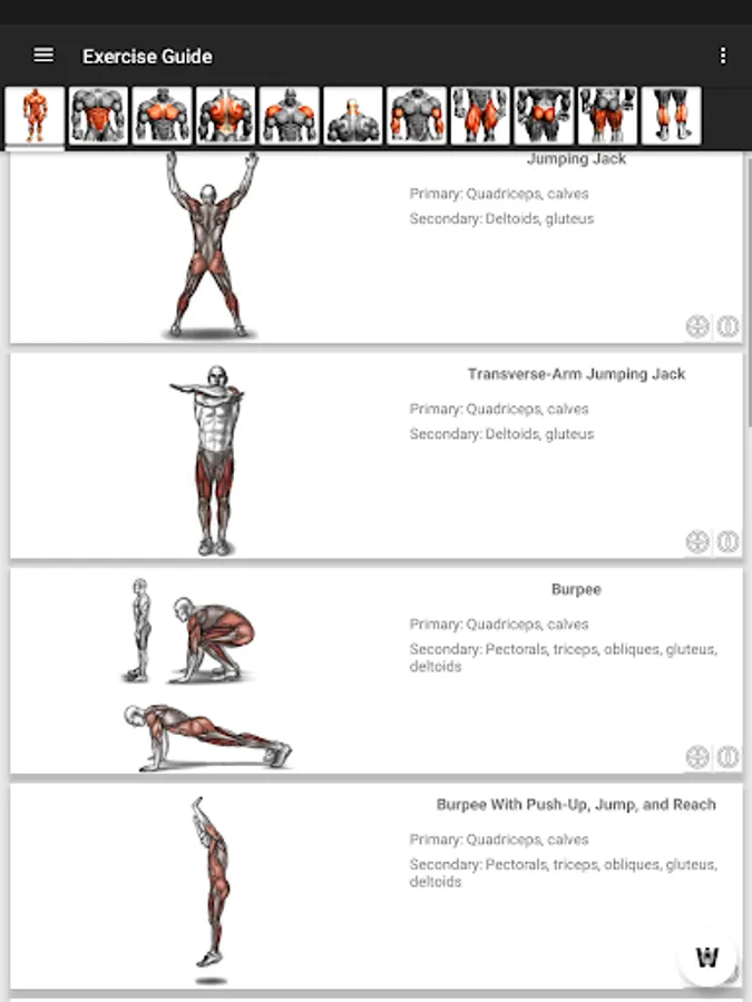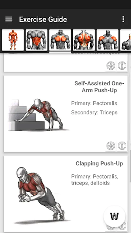 More than 150 different exercises organized by muscular groups with clear Images, explanation of the exercise, information about involved muscles, etc.