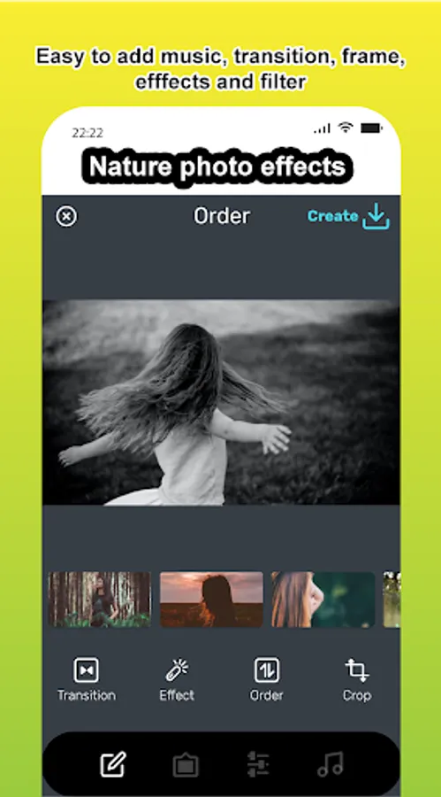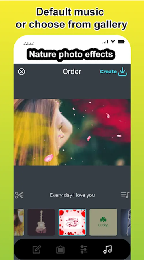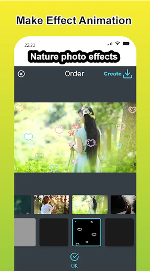 - The easy-to-use photo editor just selects the effect and icon then press the CREATE button. You will have a short video with shimmering effect for your photos.