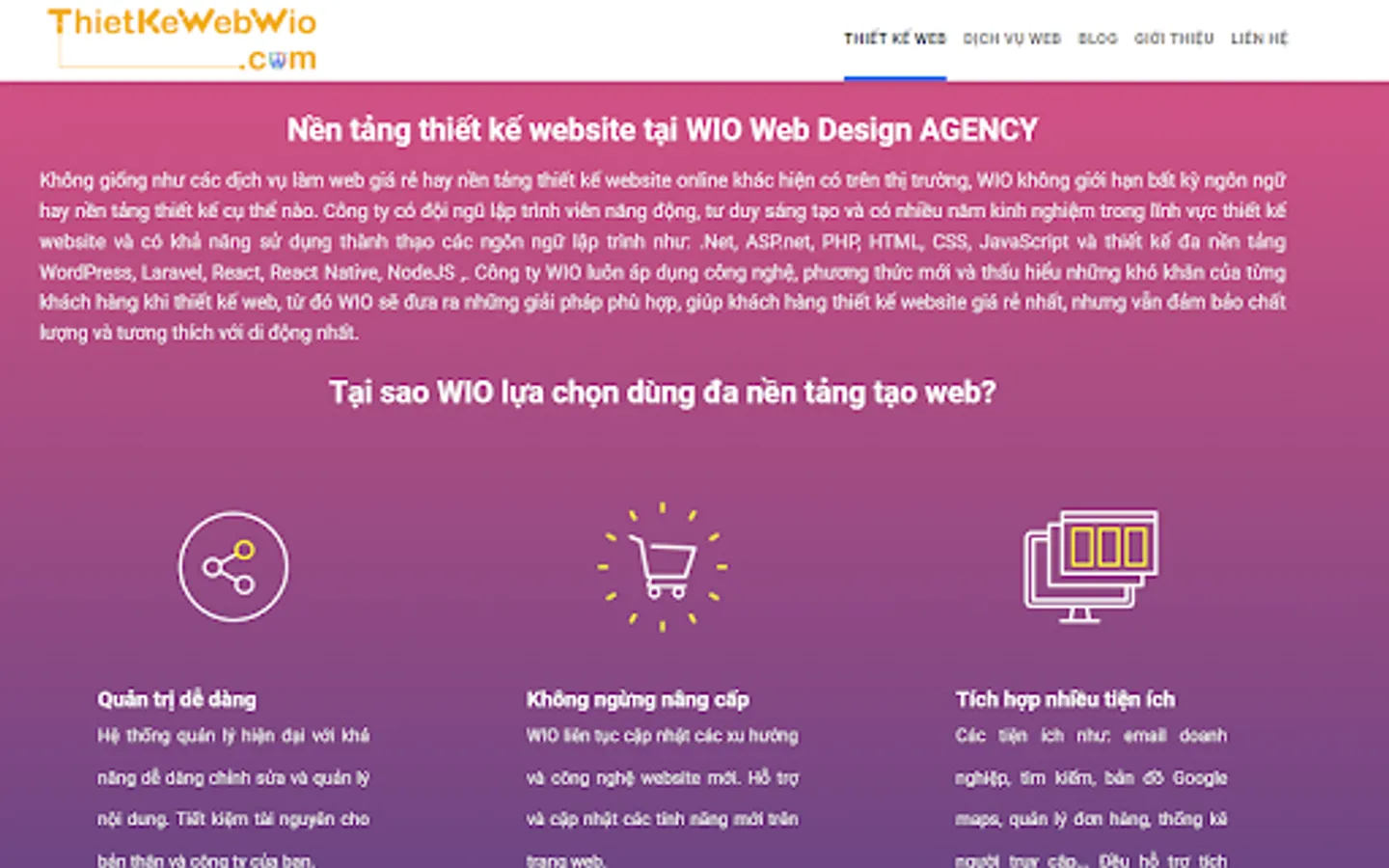 ThietKeWebWIO.com constantly updates new website trends and technologies with a basic to complex web interface that still ensures Onpage optimization, SEO standards easily to TOP search on Google, Bing,...