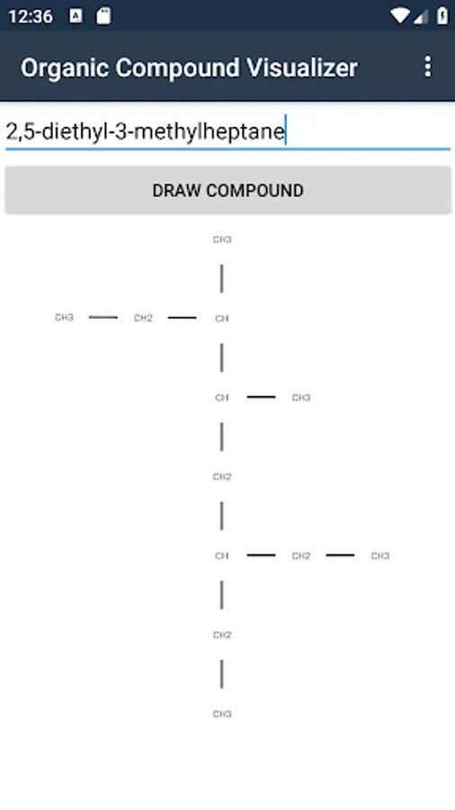 Enter the IUPAC name of an organic compound and this app will automatically generate an image of the compound. Capable of handling straight as well as mono-cyclic compounds. However on the moment only compounds containing carbon and hydrogen can be handled.