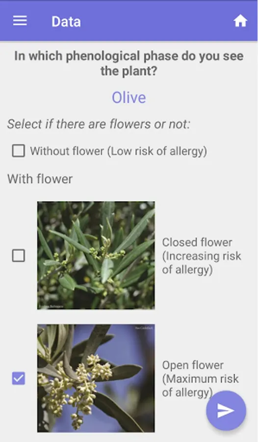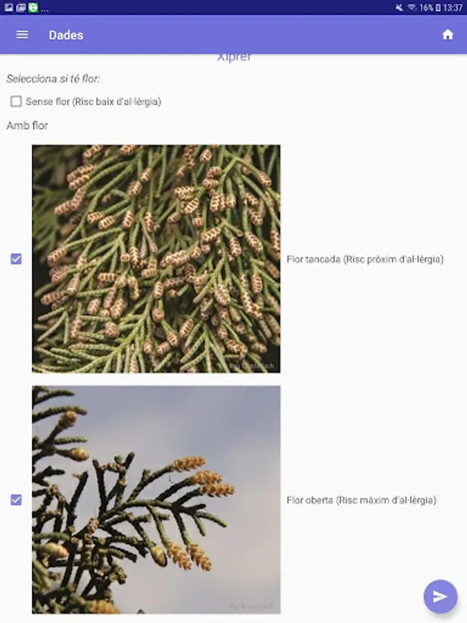 Planttes is a Citizen Science project that proposes to inform about the presence of allergenic plants in the environment and their phenological phase, which it translates into a level of allergy risk. With their records, citizens contribute to elaborate an updated map with street level accuracy of whether the chosen plant presents low risk of allergy (without flower and / or with fruit), increasing risk (closed flower), maximum risk (open flower). The visualization of this information in the map will help to avoid allergy episodes by no visiting the risk areas.
