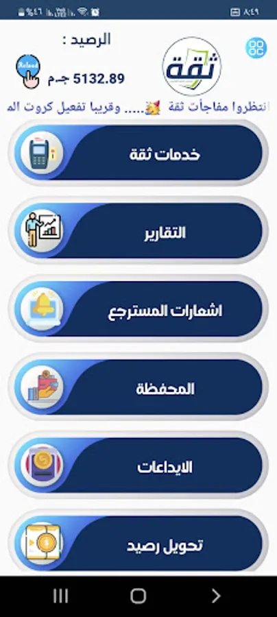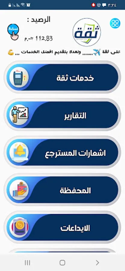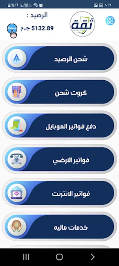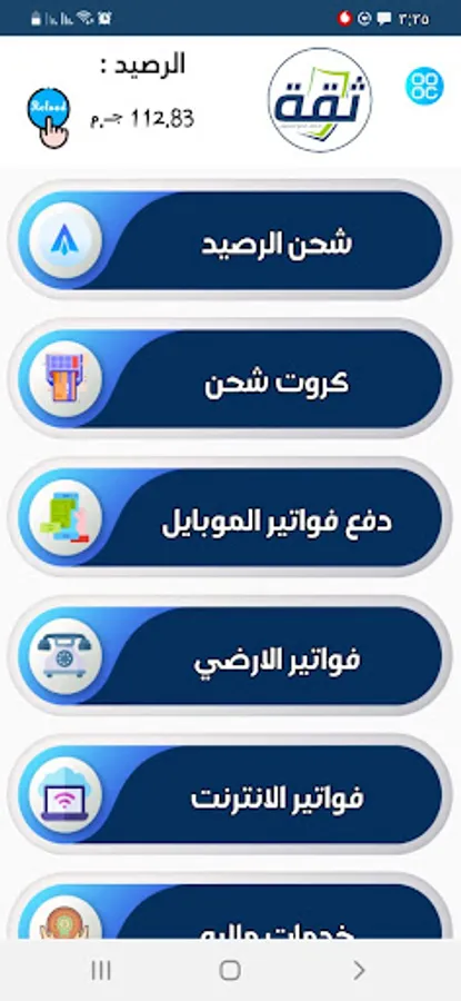 Thiqa application for electronic payment services, bill payment and balance recharge through Thiqa services with ease .. Thiqa company works in the field of information and communication technology and uses the latest technology methods to facilitate the payment of amounts due in an easy, fast and safe way.