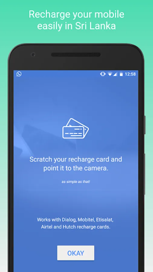Recharge cards are not annoying anymore. Recharger is the quickest way to recharge your mobile account when you have a recharge card in your hand. It can scan and read any Dialog, Mobitel, Etisalat, Hutch or Airtel recharge card so you don’t have to type the PIN number manually.