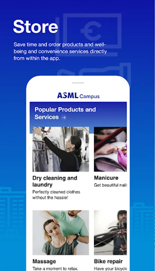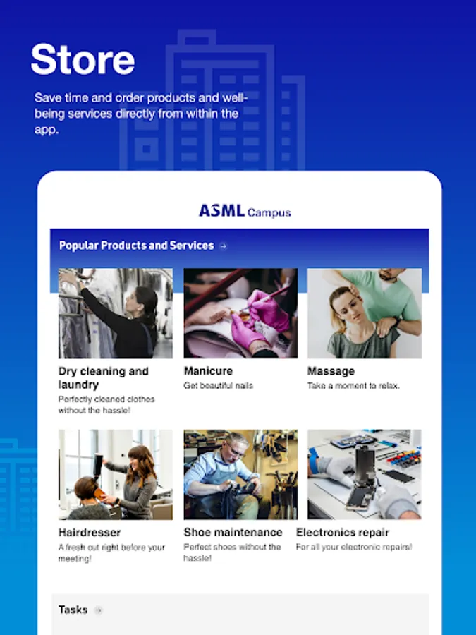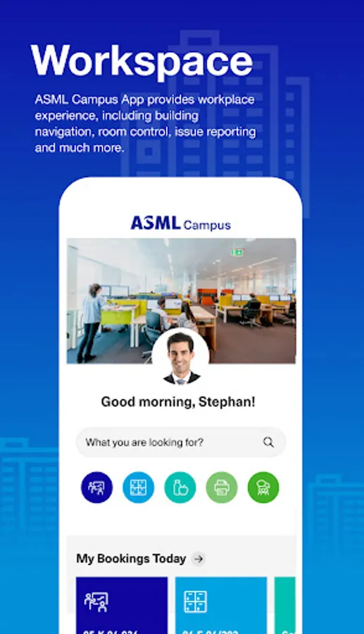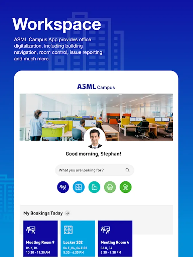 ASML Smart campus enables broader workplace and building experience on ASML campus locations including indoor Positioning via Signify VLC, indoor/Outdoor Navigation, Parking Management, Space/Desk Occupancy and Booking, Room Control, Communication and information Sharing.